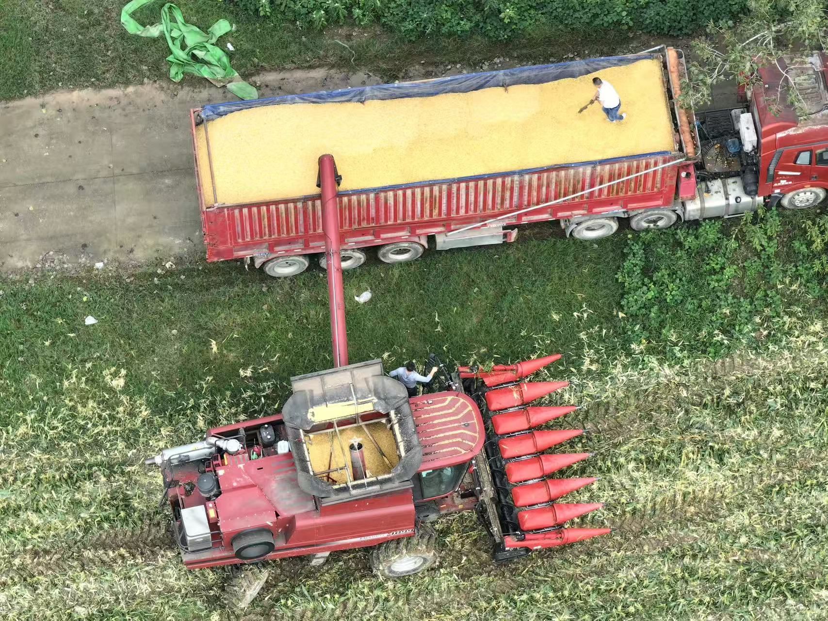 在收割機的后方,一輛輛運輸車輛早已嚴陣以待。通過輸送管,金黃的玉米粒如金色的瀑布般傾瀉而下,很快便裝滿了一車又一車。運輸車輛在田間小道上往來穿梭,將收獲的玉米運往烘干點,等待下一步走向市場的旅程。