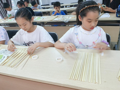 在“傳統(tǒng)竹編”非遺手工活動(dòng)中,孩子們領(lǐng)略到了指尖上的匠心。志愿者為孩子們講解了竹編技藝的歷史淵源、制作工具和基本技法,闡述了這項(xiàng)古老手工藝從實(shí)用器具到藝術(shù)精品的演變歷程及其蘊(yùn)含的勞動(dòng)智慧。實(shí)踐環(huán)節(jié)中,志愿者悉心指導(dǎo)孩子們認(rèn)真學(xué)習(xí)挑、壓、編、織等基本手法,親身體驗(yàn)竹編制作的樂趣。經(jīng)過努力,一把把精巧的小團(tuán)扇在孩子們手中誕生,讓他們收獲了親手創(chuàng)造的成就感,增強(qiáng)了對竹編非遺技藝的認(rèn)同感。