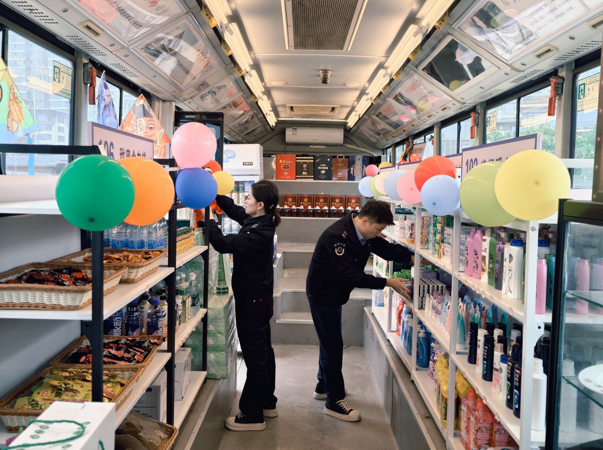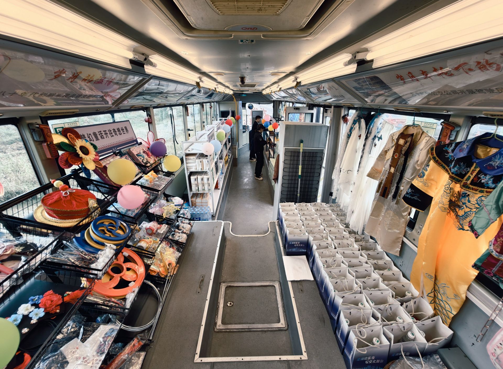 走進驛站,改造巧思隨處可見。車身保留了經典的公交輪廓,車內則配備了空調與冰柜,營造出舒適的購物環境。貨架上,從洗發水、沐浴露等日常用品,到本地土特產、飲料零食一應俱全,充分滿足了不同的消費需求。此外,驛站還特別準備了多套古風、休閑風拍照服裝,結合車身外繪制的“龍湖風景+公交元素”彩繪,使其迅速成為游客駐足留念的熱門背景。