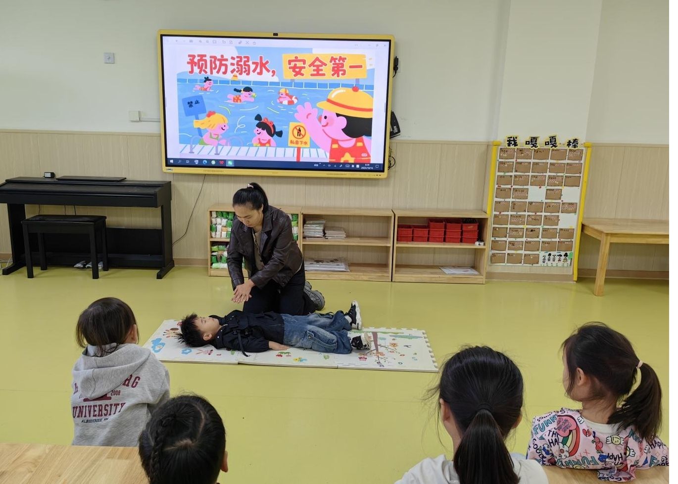 中大班教師通過展示圖片、播放趣味動畫片,引導幼兒認識“禁止游泳”的安全標志,了解哪些地方是危險水域。老師們還組織了情景表演,讓幼兒在模擬演練中學會大聲呼救、尋找大人幫助,而不是盲目下水施救。