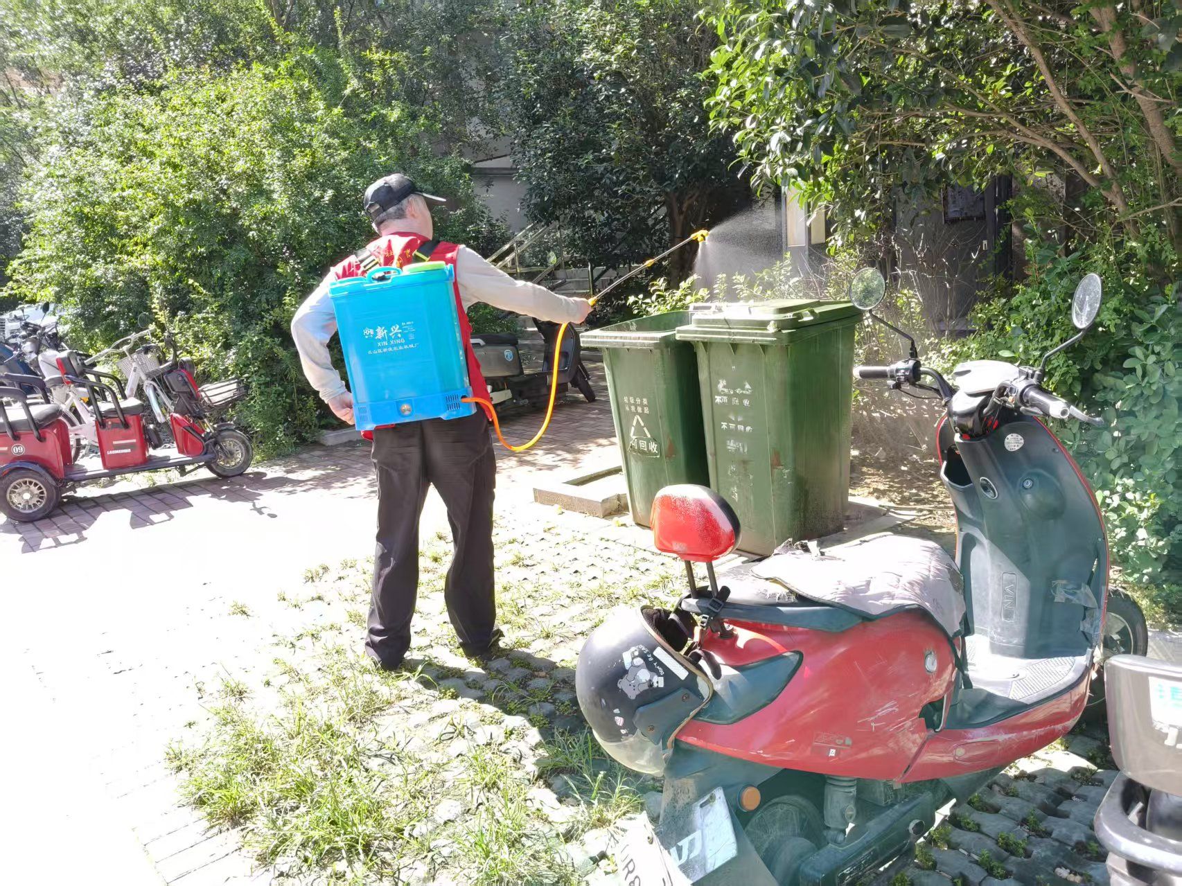 社區(qū)工作人員、小區(qū)物業(yè)人員和黨員志愿者每日對小區(qū)院落公共區(qū)域開展常態(tài)化消殺,對公共綠化帶、樓道、垃圾站、排水溝、地下室等重點區(qū)域進行集中噴藥消殺,并組織專人每日巡查并清除室外各類蚊蟲滋生地,確保無衛(wèi)生死角。
