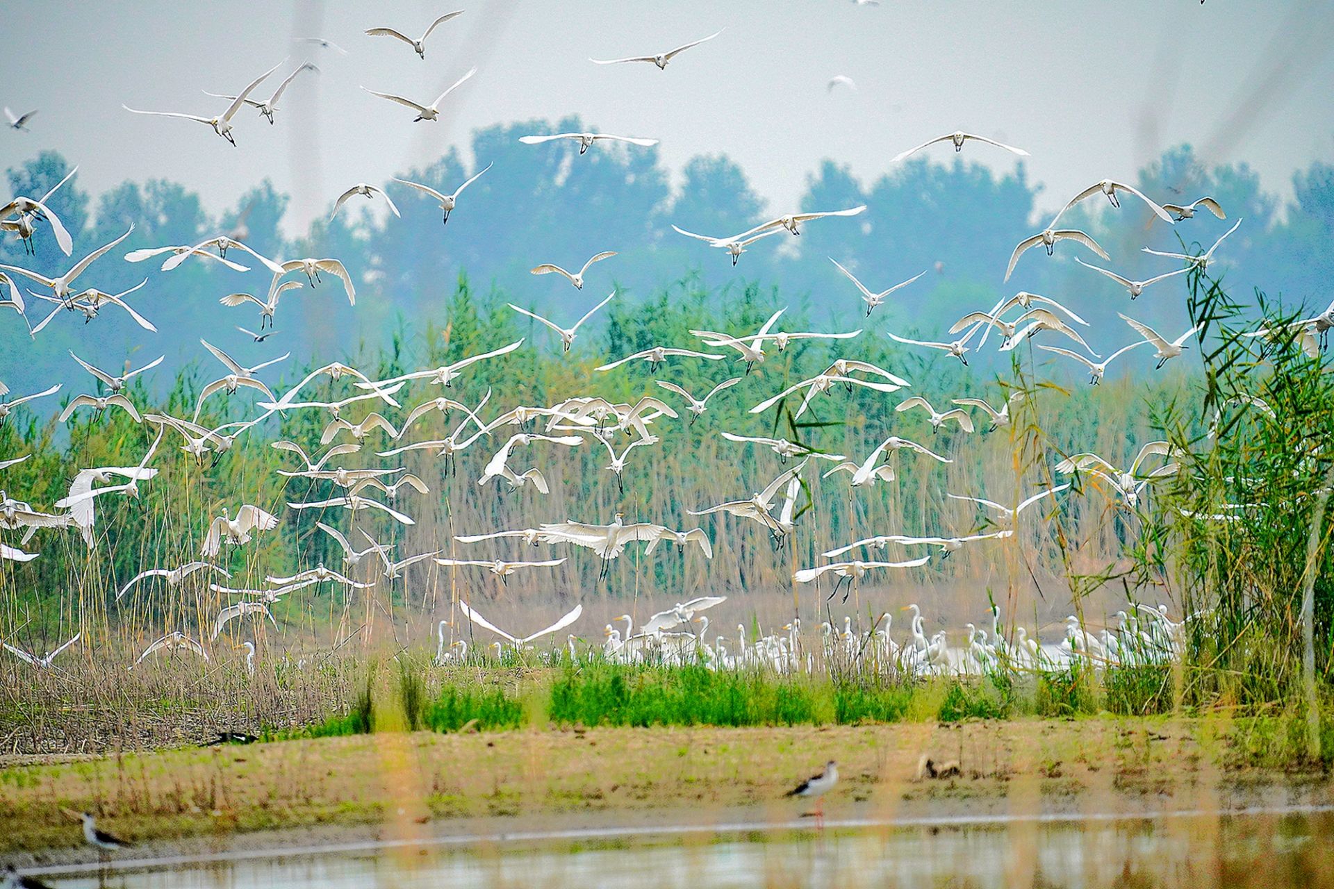 2017年至今,三汊河國家濕地公園監(jiān)測(cè)到的鳥類從最初的103種增加到189種,其中國家一級(jí)鳥類4種,二級(jí)26種。圖為白鷺鳥群。