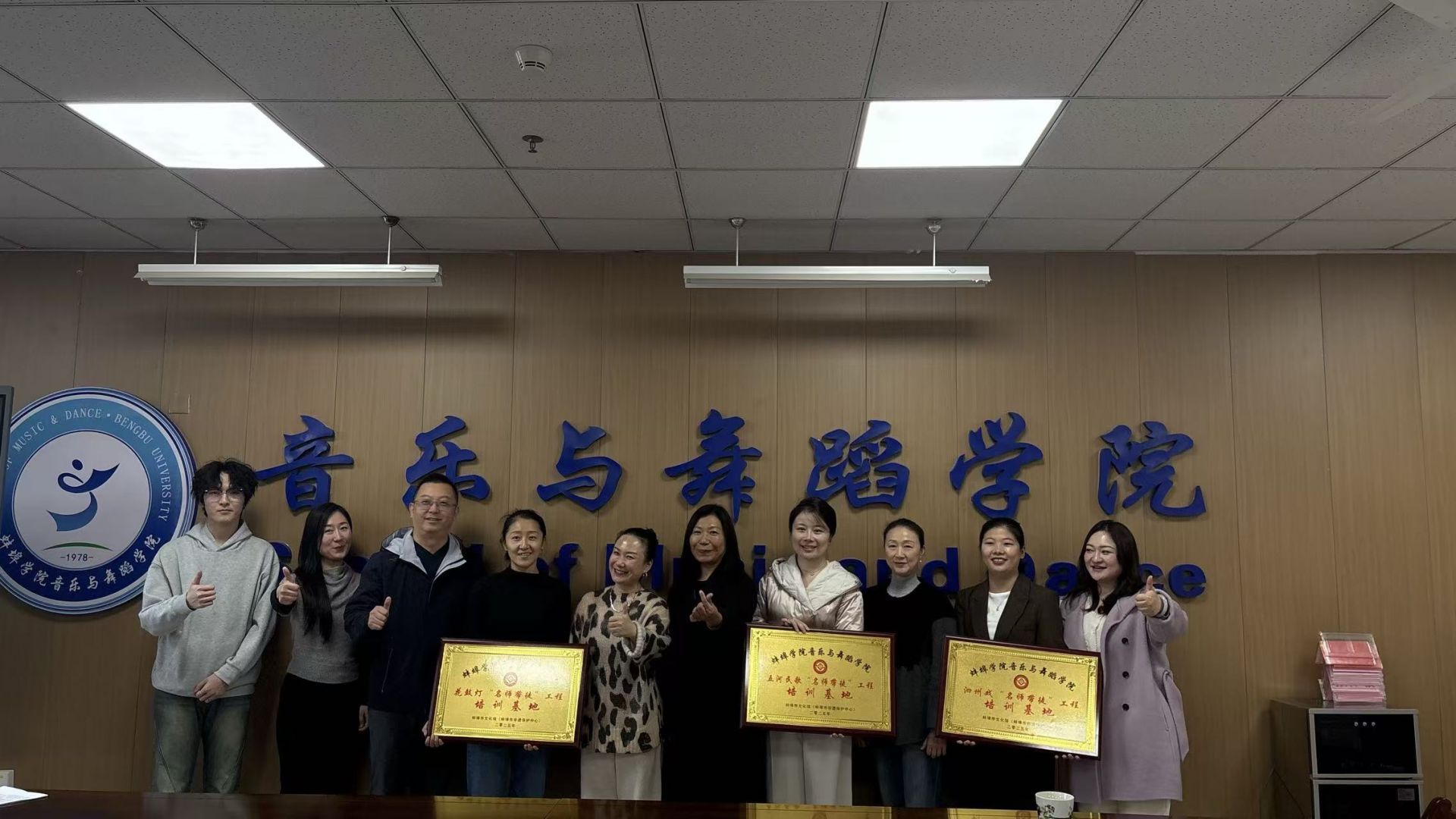 近日,蚌埠市文化館(市非遺保護中心)在蚌埠學院音樂與舞蹈學院隆重舉行非遺“名師帶徒”授牌儀式,正式為該學院授予花鼓燈、五河民歌、泗州戲三個國家級非遺項目培訓基地牌匾。