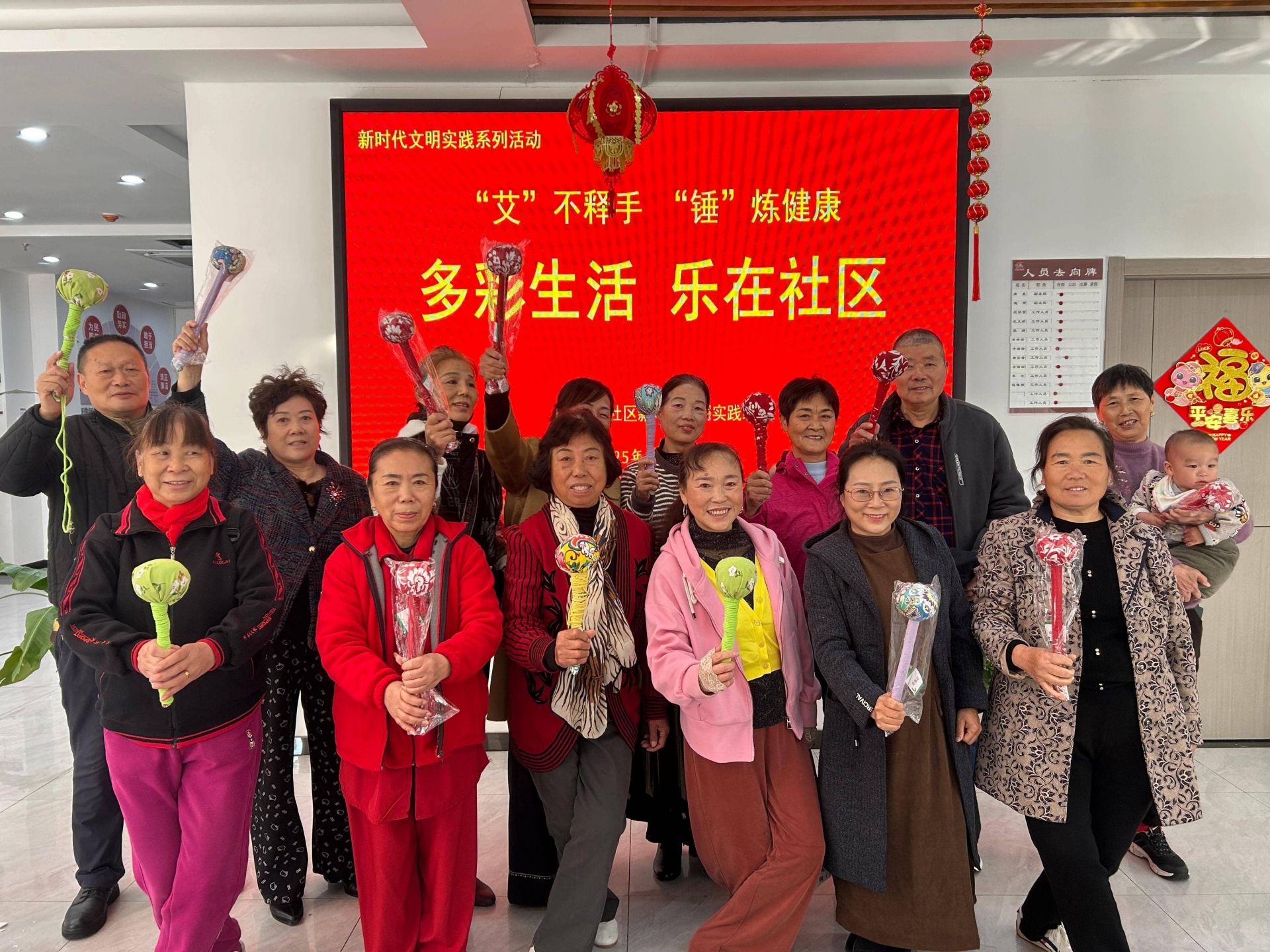 上午9點(diǎn)剛過,社區(qū)小廣場的戲臺(tái)前便坐滿了人。安徽省花鼓燈歌舞劇院的演員歌聲婉轉(zhuǎn)悠揚(yáng),黃梅戲《天女散花》的調(diào)子回蕩在人群中——“采得鮮花到人世,好分春色到凡塵”,熟悉的鄉(xiāng)音裹著淮河兩岸的煙火氣,讓張奶奶跟著哼起了腔。小手裹著軟軟的艾草,來自山香方格子幼兒園的小朋友們正跟著社區(qū)工作人員折布、填絨,把秋陽的暖、艾草的柔,都纏進(jìn)彩繩里。“這是給爺爺奶奶的禮物!”梳小辮的小朋友舉著艾草錘,把尊敬老人的品德深深刻在心里。