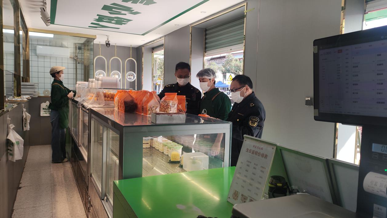在核查證照資質與從業人員健康證明的基礎上,執法檢查人員直奔經營主體后廚,重點聚焦面粉等原料溯源憑證、餡料貯存溫度控制、食品添加劑規范使用等關鍵環節。在一家老式糕點坊內,執法人員仔細核驗進貨臺賬,逐項核對電子“票證推”信息,確保原料來源可溯、渠道正規、票賬貨三相符。同時對操作區生熟區域物理隔離、工器具消毒流程落實等細節進行嚴格查驗,全面夯實食品安全防線。