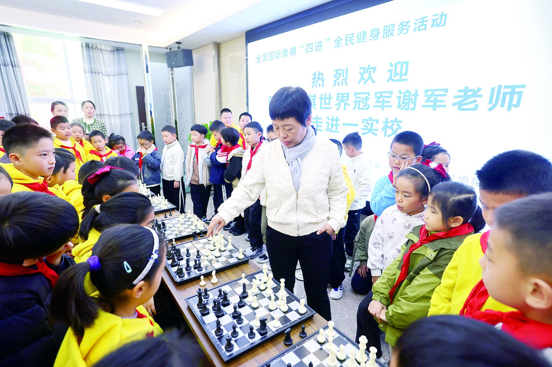 11月3日上午,安徽省蚌埠第一實驗學校的會議室里,清脆的棋盤落子聲此起彼伏。四屆女子國際象棋世界冠軍、中國國際象棋協會會長謝軍,正與該校學生展開一場精彩的“車輪戰”對弈。這場一對多的實戰交流,是全國國際象棋“四進”(進學校、進社區、進機關、進養老機構)全民健身志愿服務活動落地蚌埠的生動縮影。