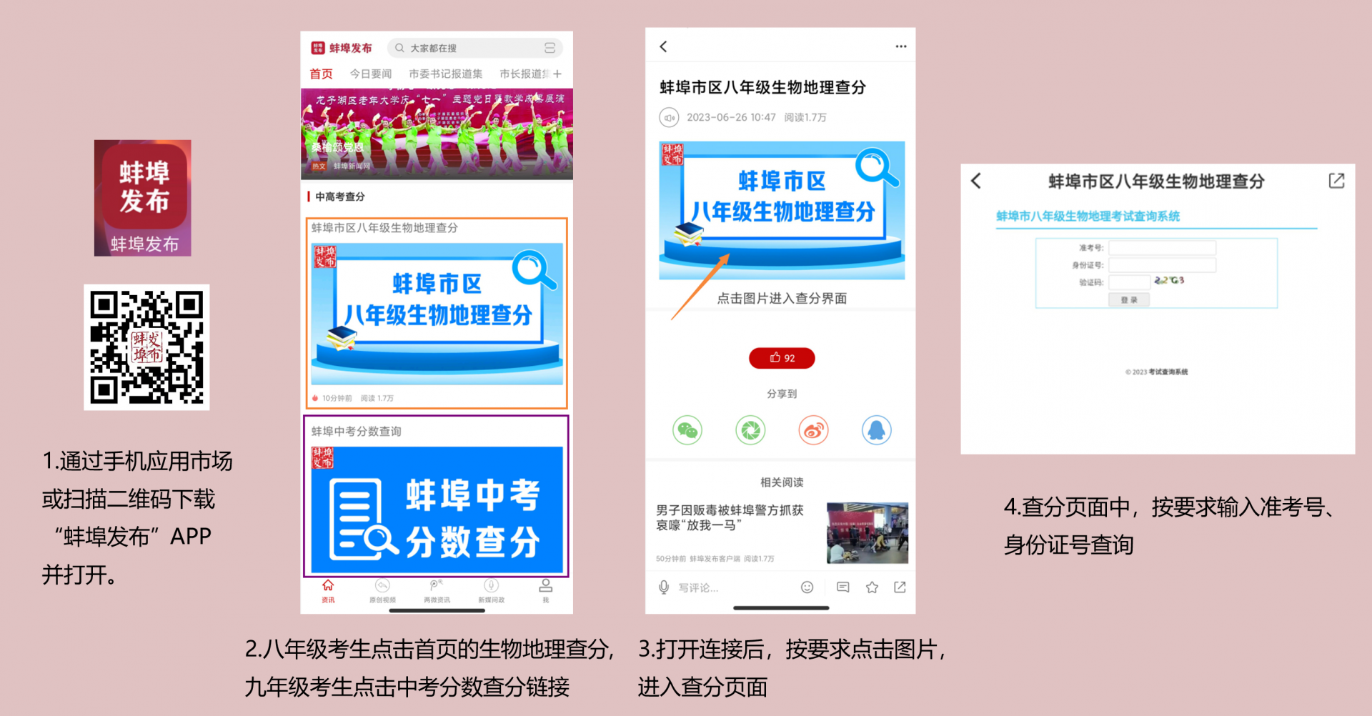 方式一:蚌埠發布APP查詢。市區八年級考生及家長下載“蚌埠發布”APP,打開首頁“蚌埠市區八年級生物地理查分”版塊圖片,6月28日上午9點開始,輸入考生準考證號及身份證號,可以查詢考生的生物地理成績;