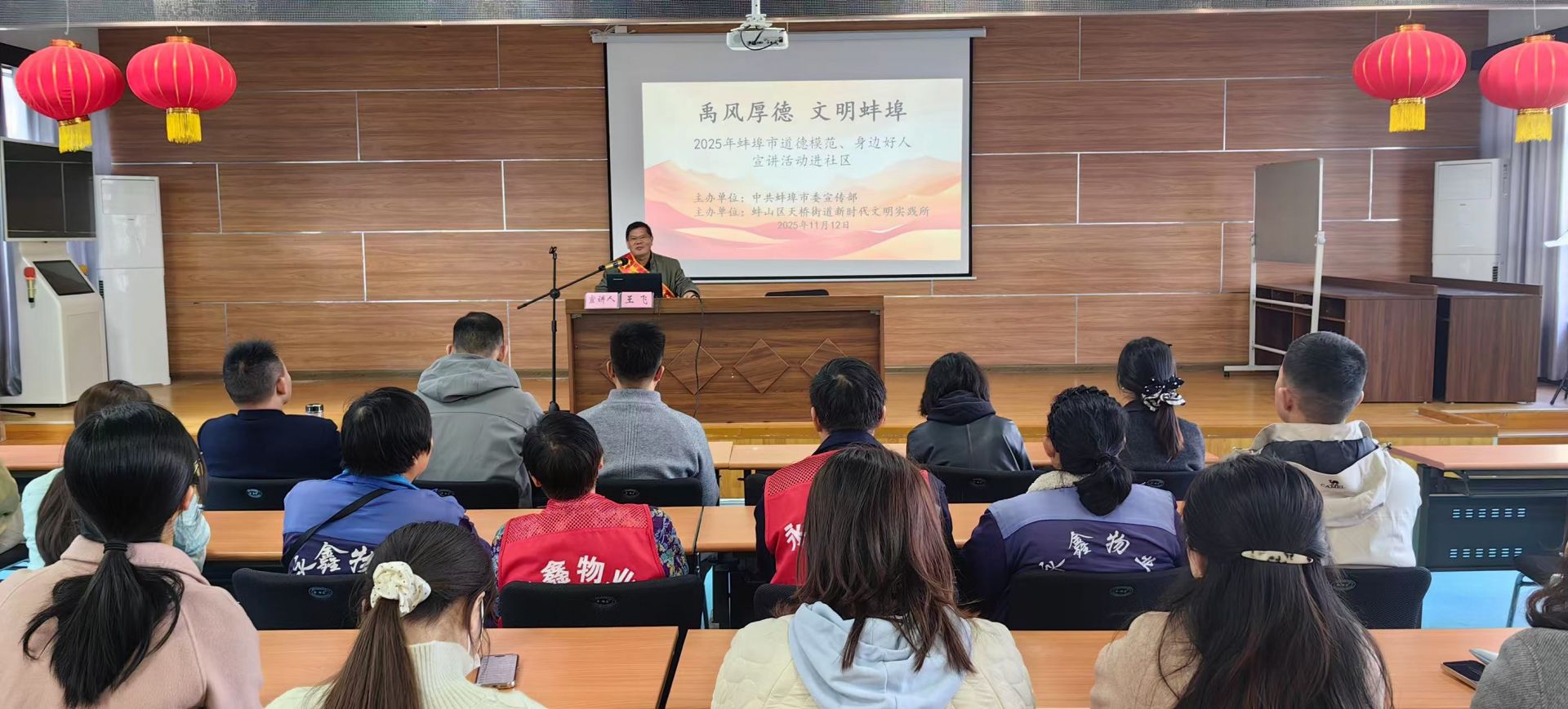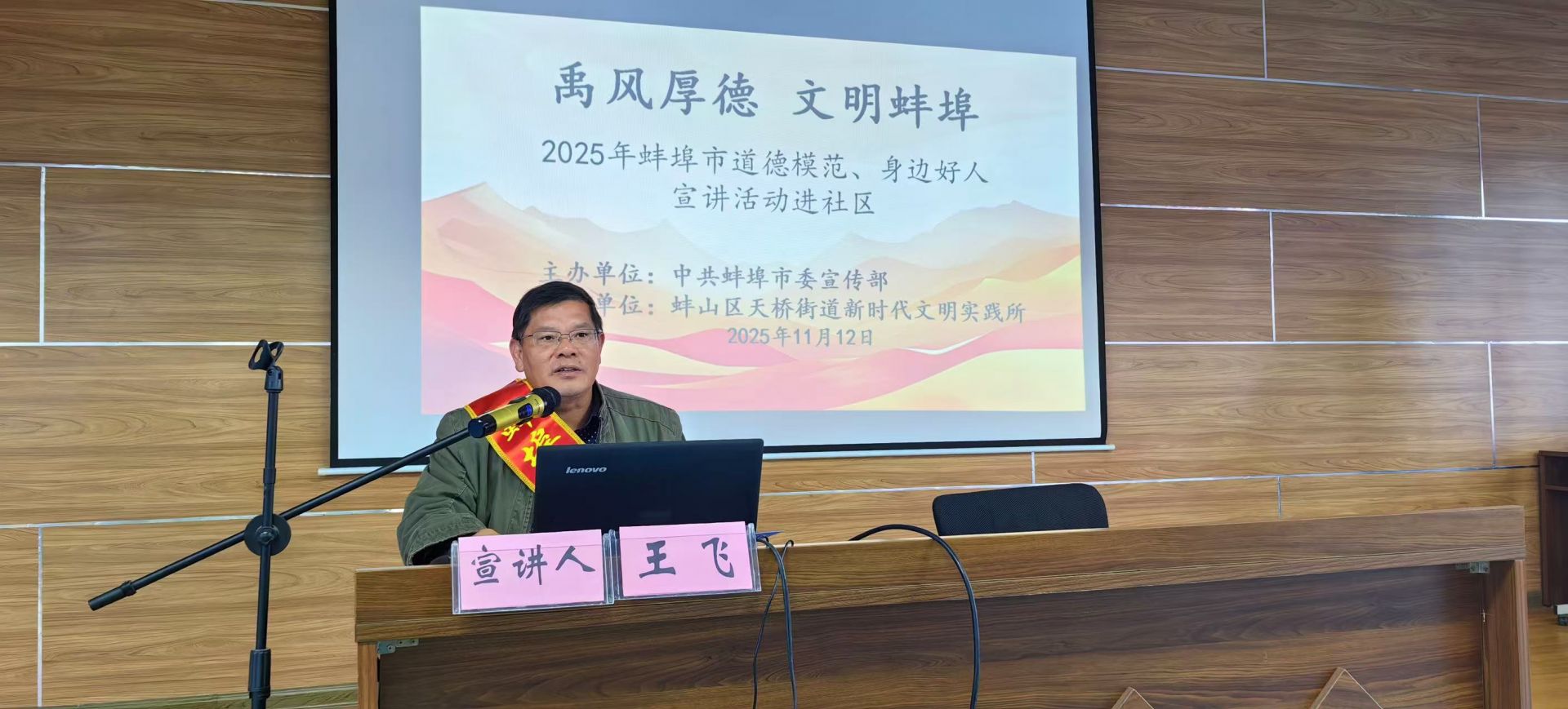 近日,由中共蚌埠市委宣傳部主辦的“禹風厚德 文明蚌埠”——2025年蚌埠市道德模范、身邊好人宣講活動,走進蚌山區天橋街道新時代文明實踐所,安徽省“百名孝星”、蚌埠好人王飛為現場觀眾帶來了一場直抵心靈的分享。