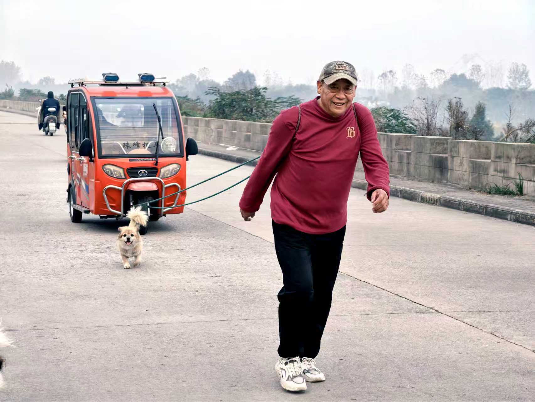 “老爺子虛歲100啦!1926年生,身子骨還算硬朗!”劉德才邊調(diào)整肩頭的繩結(jié)邊笑著說道。四年前,他發(fā)現(xiàn)父親年邁不愿在家喜歡坐三輪車出行,偶然間想到用繩子拉車,既能讓老父親出來放風(fēng)、遛彎、散心,自己也能順便鍛煉,一舉兩得,便開啟了每日兩趟的“拉車晨練”。如今,他每天清晨六點(diǎn)至七點(diǎn)多、下午一點(diǎn)多到三四點(diǎn)準(zhǔn)時(shí)出發(fā),沿淮河堤壩往返三公里,只為老人舒心、自己盡興。