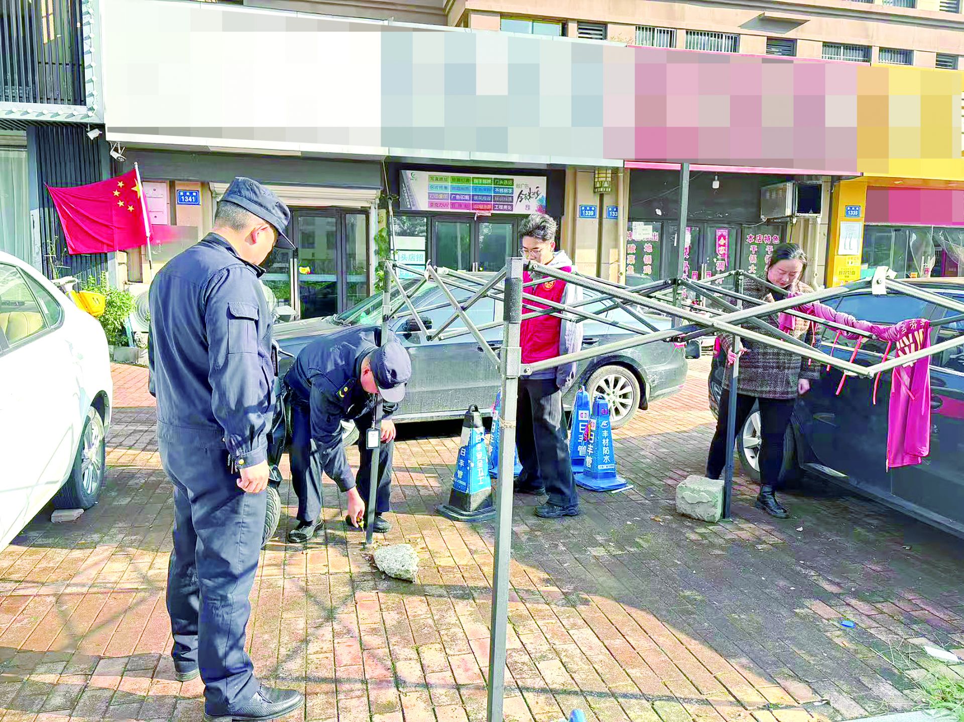 由于兩側的店面都是住宅樓“底商”,緊貼樓上居民,混亂嘈雜的環境和喧囂不僅影響了路面環境,也對居民生活造成了一定影響。社區當然要上門做工作——新地城市廣場社區書記俞靜回憶起當時的情景:“我們多次上門與這些店主溝通,但效果甚微。對方往往只是口頭答應‘好好好,知道了’,然后繼續我行我素。”面對這一困境,社區想到了“城管進社區”機制。蚌山區城管局淮河中隊中隊長劉鵬接到社區求助后立即響應,帶領隊員深入了解現場情況,并部署力量開展治理?!拔覀兌啻紊祥T勸導,并安排人員每天定點巡視、實時監督,逐步改善了這一區域的占道情況?!眲Ⅸi介紹。