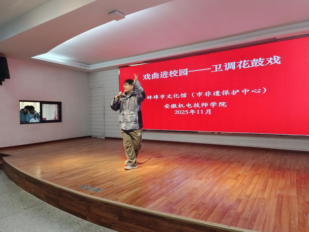 11月25日下午,蚌埠市文化館(市非遺保護中心)走進安徽機電技師學院(安徽電子工程學校),開展非遺進校園活動。與傳統的舞臺表演不同,年輕的傳承人向學生們展示了非物質文化遺產項目——衛調花鼓戲,它以婉轉的唱腔、靈動的身段和濃郁的地方特色,被列入安徽省非物質文化遺產名錄。