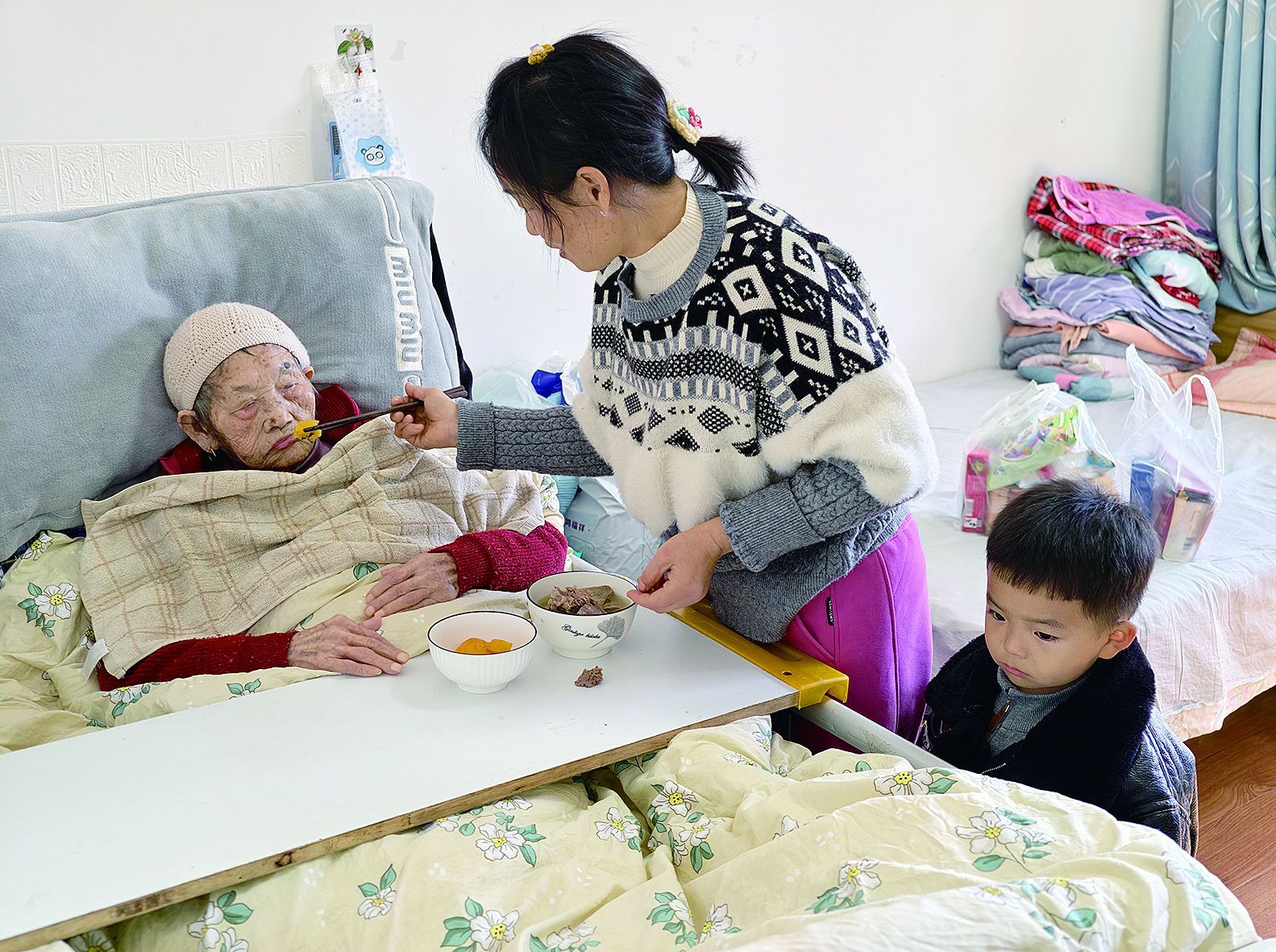 今年6月,97歲的紀(jì)秀蘭身體急轉(zhuǎn)直下,痰液阻塞導(dǎo)致呼吸困難、無法進(jìn)食。葛林芝寸步不離守在床邊,聽到老人喉嚨里的異響,就立刻小心翻身、拍背,用棉簽一點(diǎn)一點(diǎn)清理痰液,耐心安撫因不適而躁動的老人,常忙碌至深夜。老人吞咽功能弱,她把飯菜磨成細(xì)膩的糊狀,用小勺一口口喂,一次喂食要耗近一個小時。那段日子,她既要盯著老人的呼吸,又要哄著哭鬧的孫兒,家務(wù)、農(nóng)活也沒落下,瘦了好幾斤,卻從沒喊過一句累。好在老人奇跡般好轉(zhuǎn),如今精神尚佳,成了家里“溫暖的生命亮色”。
