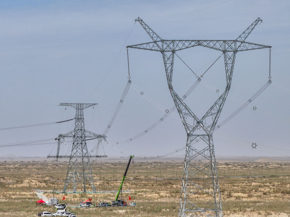 2025年7月13日,在塔里木盆地南緣的新疆和田地區(qū)民豐縣,隨著牽引機(jī)將最后一段電線成功從183號(hào)鐵塔拽至188號(hào)鐵塔,歷時(shí)15年建設(shè)的環(huán)塔里木盆地750千伏輸變電工程全線貫通(無人機(jī)照片)。新華社記者 丁磊 攝