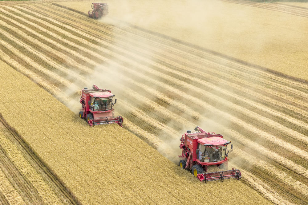 ??2025年6月9日,河南省三門峽靈寶市西閻鄉(xiāng)東古驛村村民在搶收小麥(無人機(jī)照片)。新華社發(fā)(杜杰 攝)