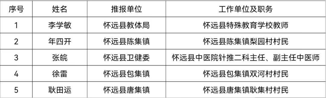 蚌埠文明網訊 經過層層推評、評委會認定,懷遠縣從各鄉鎮和縣直單位推報的22名候選人中,評選出5名同志入選“懷遠縣2023年第二季度“懷遠好人榜”。現將擬當選名單公示如下: