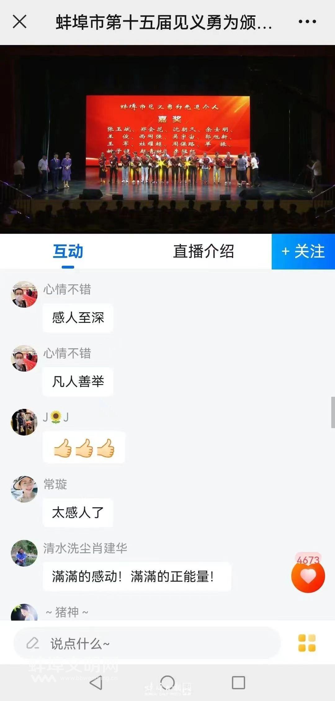 7月10日下午,由中共蚌埠市委政法委員會(huì)、蚌埠市人民群眾見義勇為獎(jiǎng)勵(lì)基金會(huì)主辦,蚌埠日報(bào)社協(xié)辦的蚌埠市第十五屆見義勇為頒獎(jiǎng)典禮在市文化館舉行,233.65萬人次通過人民網(wǎng)、今日頭條、蚌埠文明網(wǎng)、蚌埠日報(bào)社融媒體平臺等觀看直播。