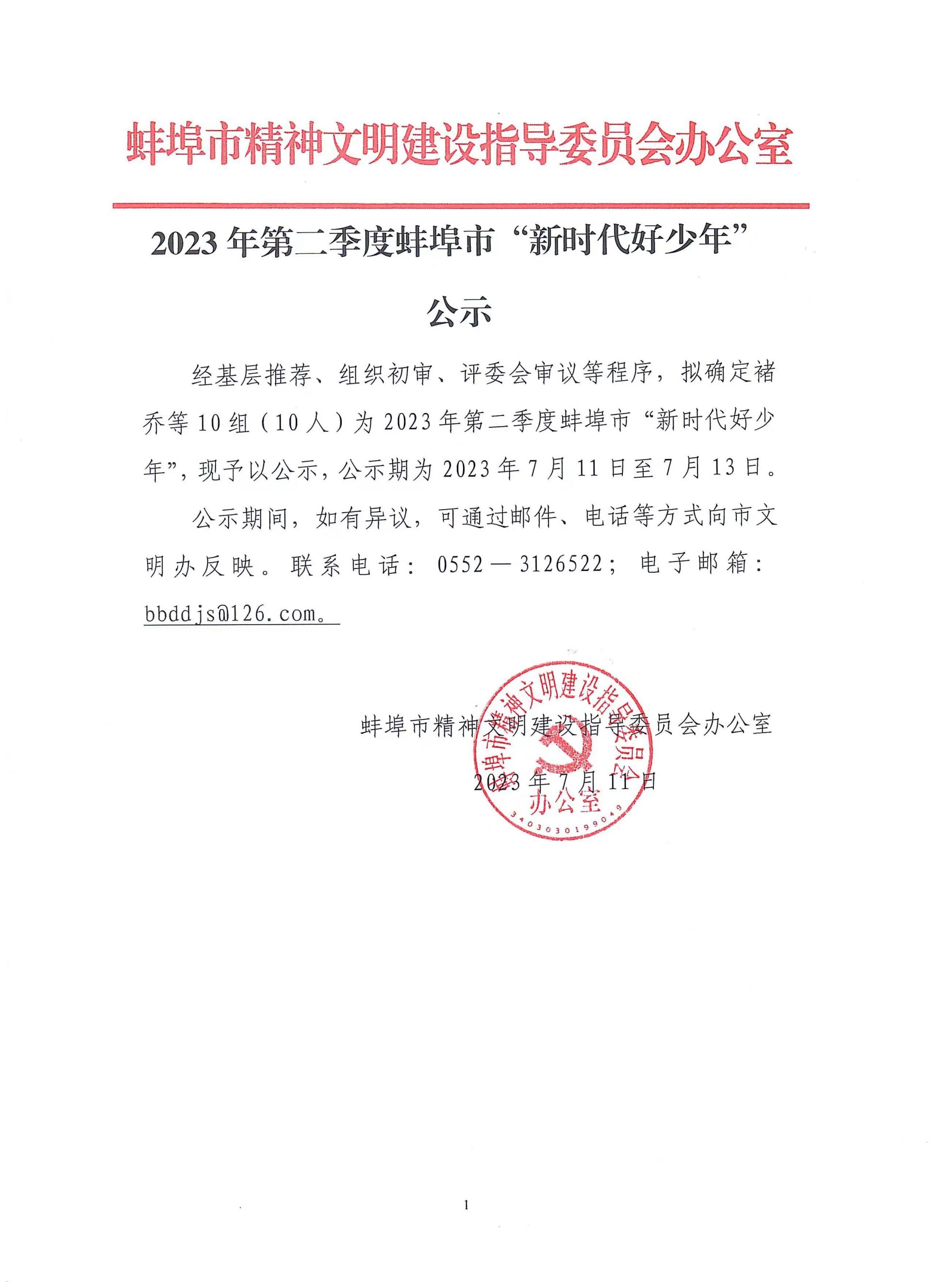 經基層推薦、組織初審、評委會審議等程序,擬確定褚 喬等10組(10人)為2023年第二季度蚌埠市“新時代好少年”,現予以公示,公示期為2023年7月11日至7月13日。