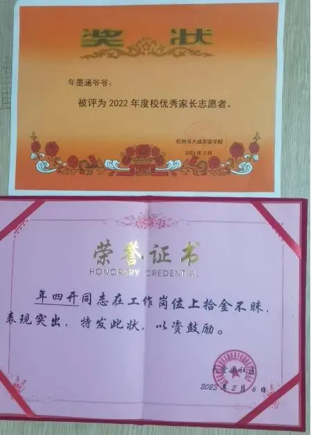 兩天后,年四開的愿望實現(xiàn)了,他收獲了雙份獎狀。周女士為表感謝贈與了他一面錦旗,社區(qū)也為年四開頒發(fā)了榮譽證書,表揚他在工作崗位上拾金不昧、品德高尚。