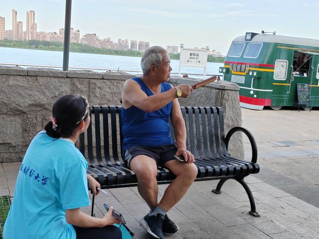 隊員們沿著公園小徑,走到公園廣場。一路上可以看到了“南北分界線”標志、游船碼頭和拍照打卡地“幸福蚌埠號火車頭”。一位手持紙扇、目光慈祥的老人吸引了隊員注意。老人年過古稀,起初說話有些費力,但對于蚌埠旅游業發展和當地特色及其歷史等侃侃而談。老人介紹道,蚌埠以前是工業城市,水路運輸和鐵路運輸都比較發達,還曾被叫做“火車拉來的城市”。其后,隨著高鐵的發展,蚌埠的交通優勢不再顯現,大量工業企業遷往合肥,發展速度放緩。現在蚌埠旅游業能夠起步、發展,無疑會成為蚌埠市經濟發展的強大推力,當地特產和文化也能得到發掘。