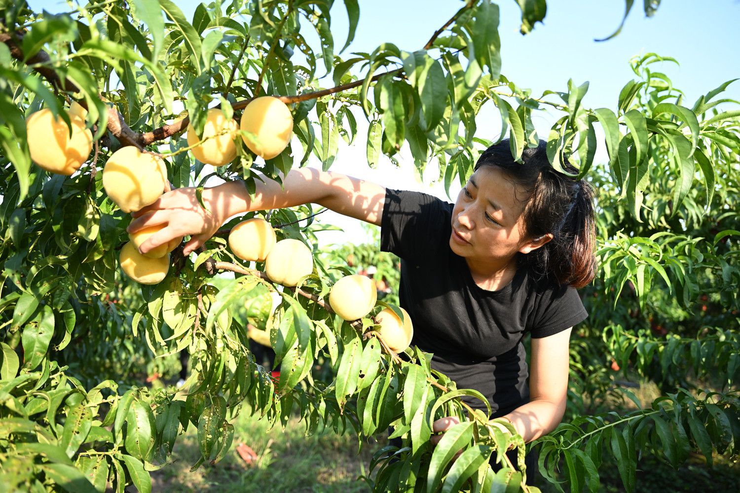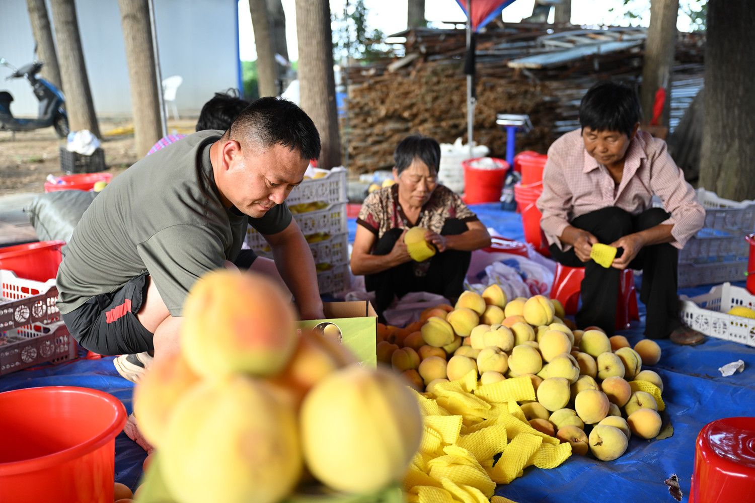 8月1日,安徽省蚌埠市五河縣頭鋪鎮劉馬村的200余畝黃桃迎來收獲季,果農們忙著采摘、分揀黃桃,供應市場。近年來,五河縣頭鋪鎮持續打造“一村一品”特色產業,形成村村有特色,產業可持續,為村民致富增收打下堅實基礎。