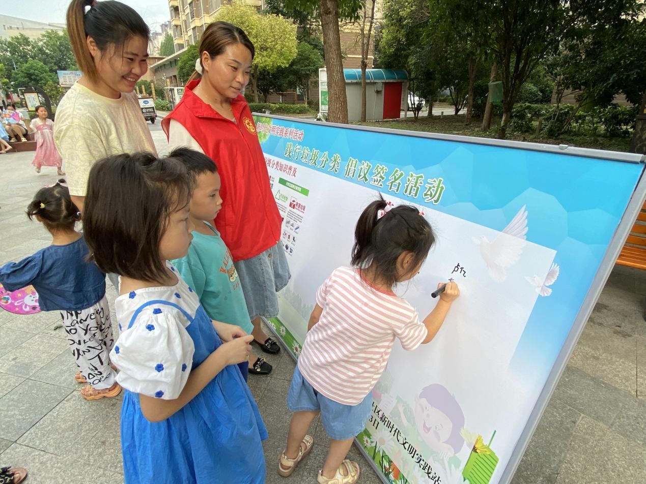 活動(dòng)現(xiàn)場(chǎng),社區(qū)志愿者通過簡(jiǎn)短的動(dòng)畫視頻讓轄區(qū)兒童和家長(zhǎng)更直觀地了解垃圾分類的相關(guān)知識(shí),志愿者重點(diǎn)對(duì)日常家庭生活中產(chǎn)生的垃圾,細(xì)致地講解如何區(qū)分廚余垃圾、其他垃圾、可回收物及有害垃圾,倡導(dǎo)大家做好垃圾分類,實(shí)現(xiàn)資源再利用。隨后,小朋友們?cè)谥驹刚吆图议L(zhǎng)的帶領(lǐng)下,來到社區(qū)東門小廣場(chǎng)進(jìn)行垃圾分類倡議簽名。