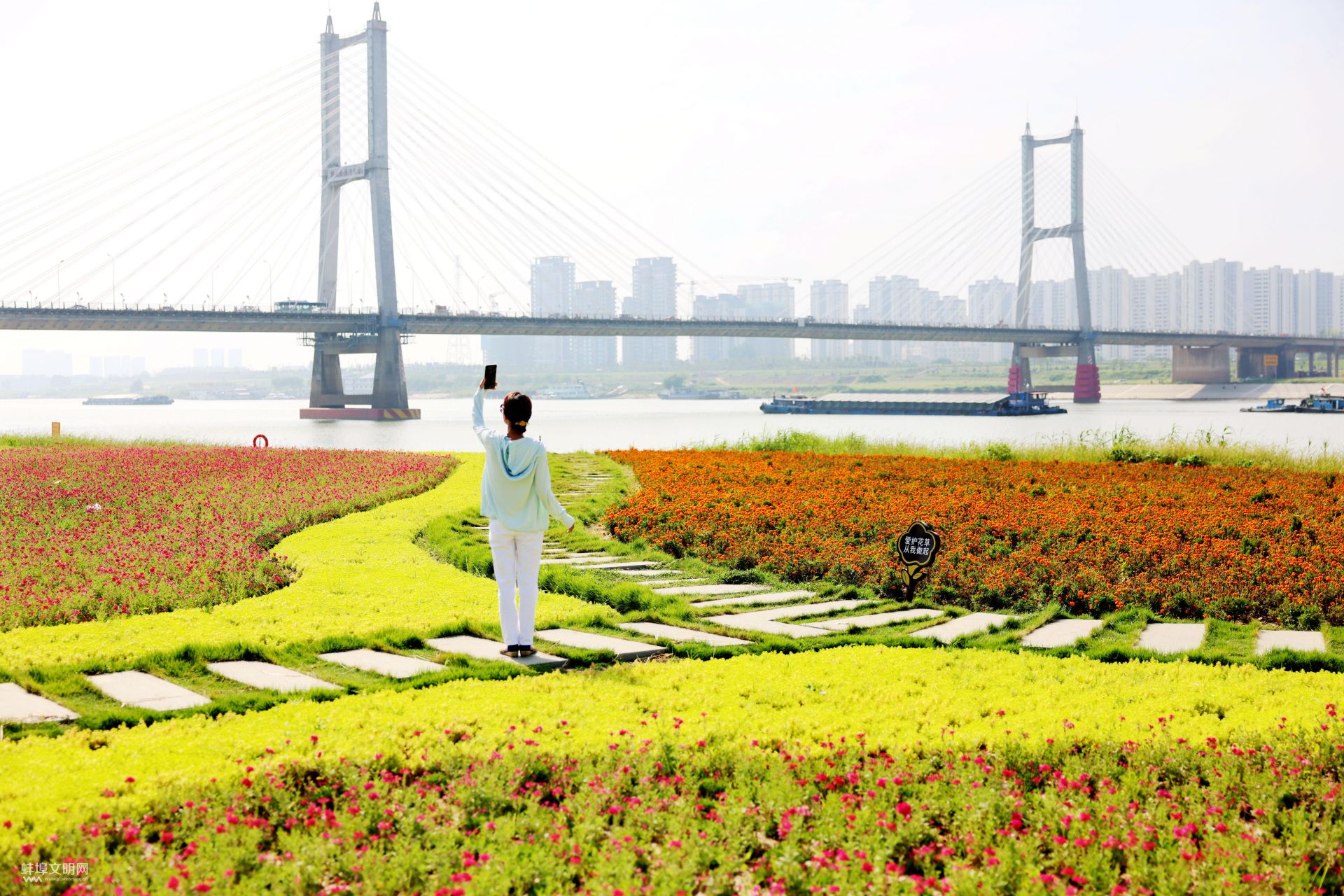 8月11日,解放路淮河大橋西側靚淮河北岸綠草茵茵、花香撲鼻,市民在此拍照游玩。 近年來,我市開展“綠滿珠城”、城鎮園林綠化提升行動等,城市綠化增量提質,市民幸福感和獲得感不斷增強。