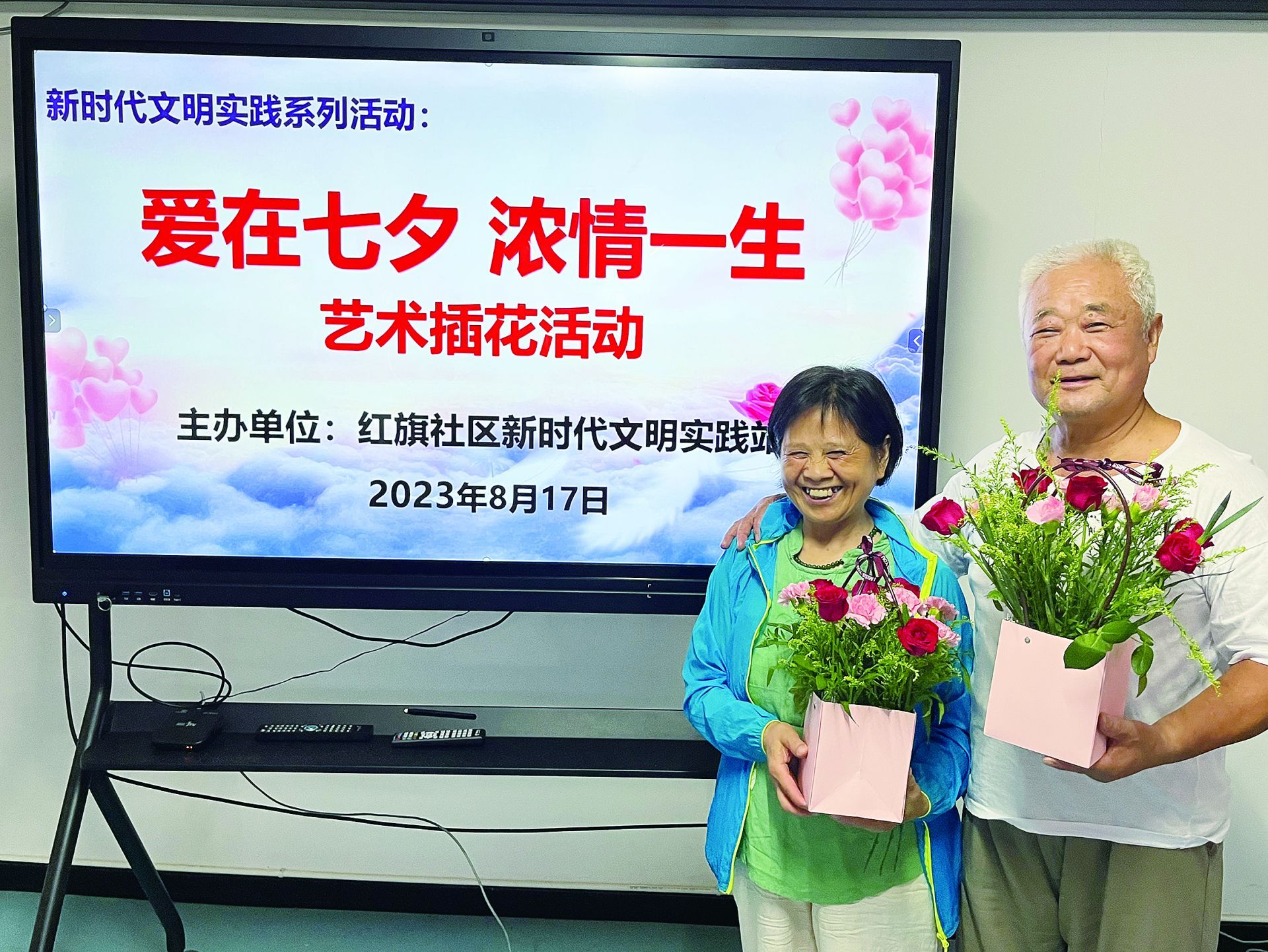 “我們結婚50多年了,幾十年的風雨兼程,使我們懂得夫妻要互相珍惜、信任、尊重、寬容。”居民田萬成和老伴沈勁松在社區(qū)志愿者的指導下,一邊相互協(xié)助選花插花籃,一邊開心地和鄰居們聊天,話家常。