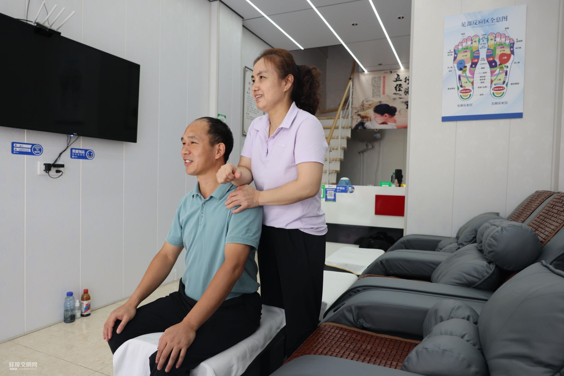 孫善剛、王夢蓮夫婦二人在交通三巷步行街開了家足療按摩店,閑暇時間兩人互相按摩緩解勞累。