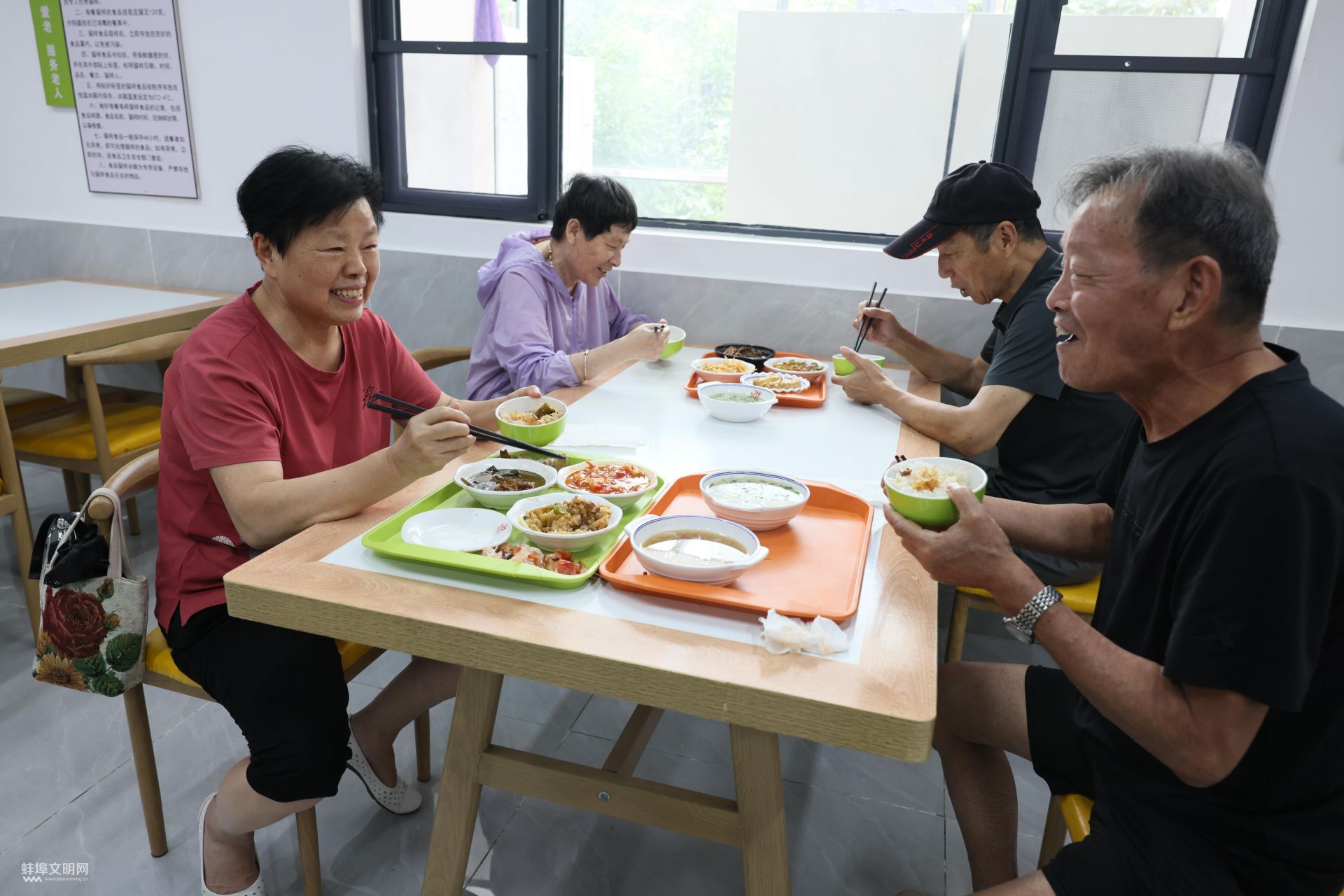 趙玉萍(左一)、司燕民(右一)是一對金婚夫妻,朱學元、朱玉玲則是一對銀婚夫妻,七夕前夕,他們在文竹苑社區老年食堂吃午飯,共同回憶年輕時的浪漫故事。
