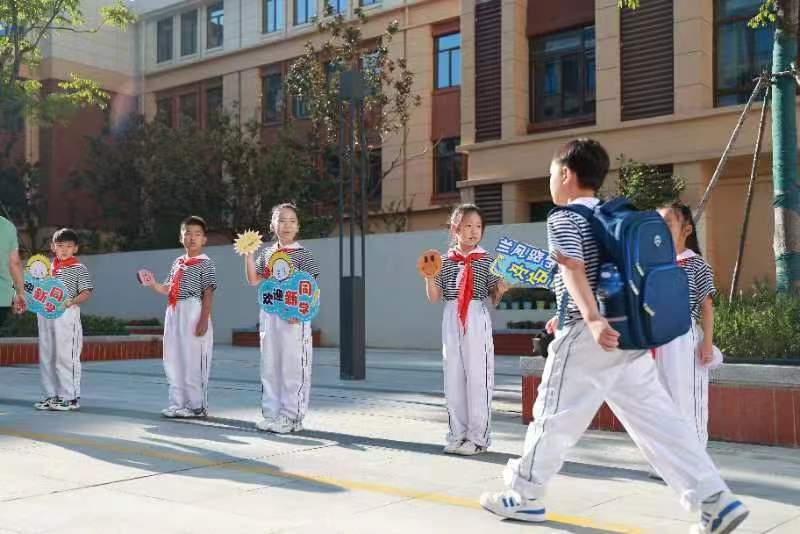 新學期,新起點。9月1日,蚌埠第二實驗學校教育集團蘭鳳路學校首批少先隊員們身著整潔的校服手持歡迎牌迎接新生的到來。