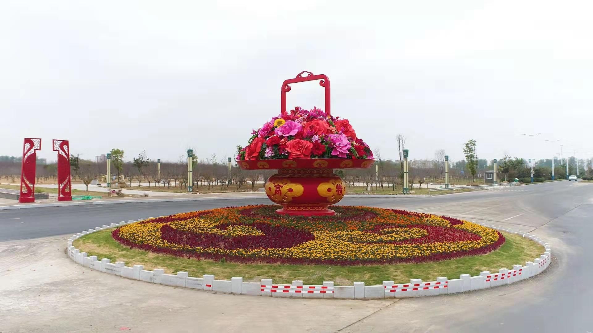 谷陽城遺址公園入口,碩大的花籃寓意“高特美強”新固鎮歡迎八方賓朋。
