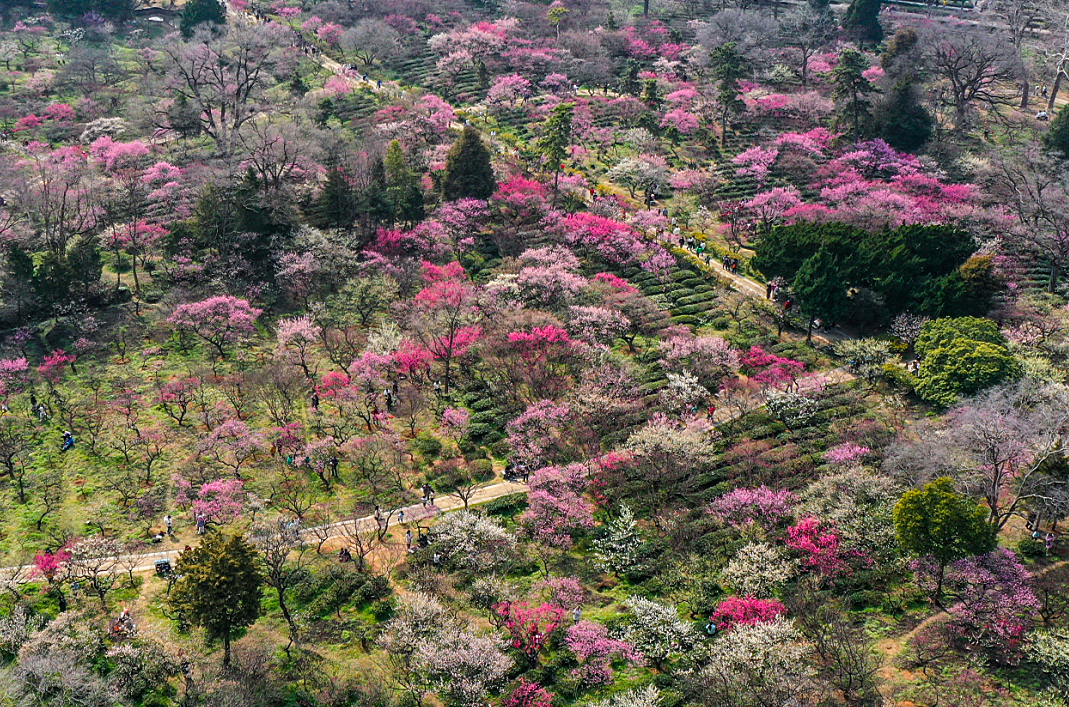 2月19日,游客在江蘇南京梅花山賞花游玩(無人機照片)。