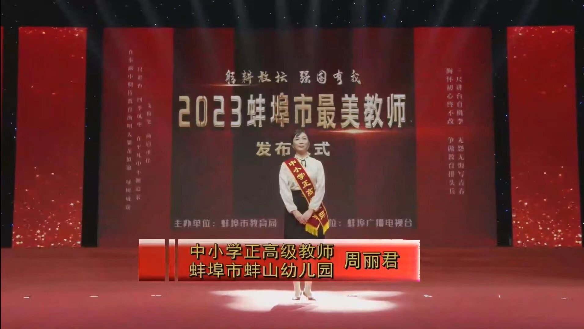 此次發布儀式,蚌山幼兒園周麗君園長作為“中小學正高級教師”代表參與此次發布會并授予頒獎。周麗君,蚌山幼兒園正高級教師,全國優秀教師,堅守幼教崗位32年,她是一個執著的教育逐夢者,她用忠于理想的守望,用瘦小的身軀托舉初心和夢想。