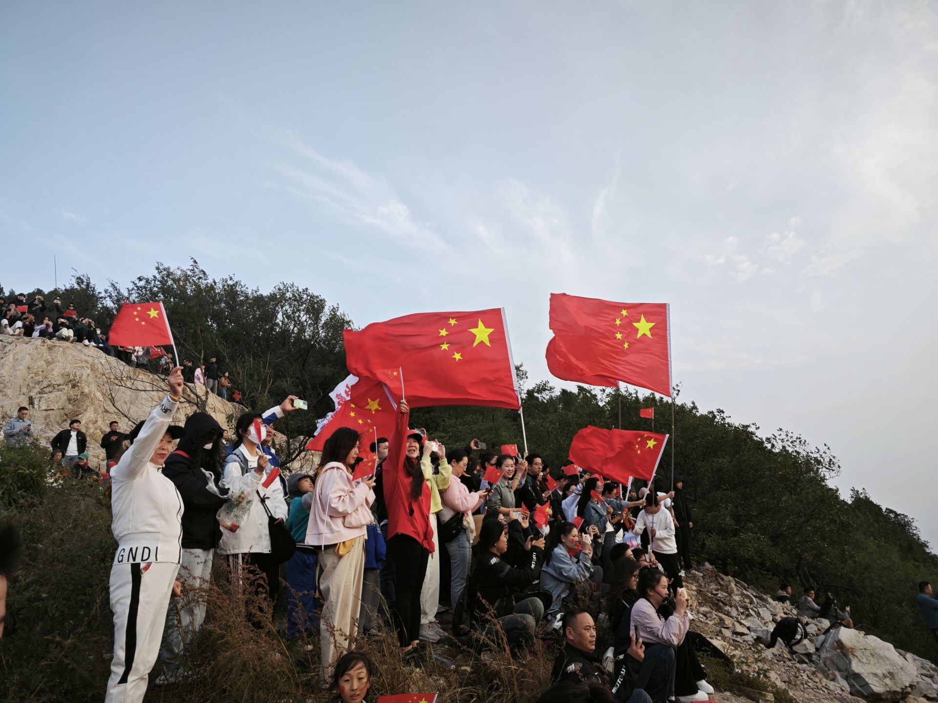 10月1日,數百名市民夜爬涂山,揮舞手中鮮艷的國旗迎接日出。 王立春 攝