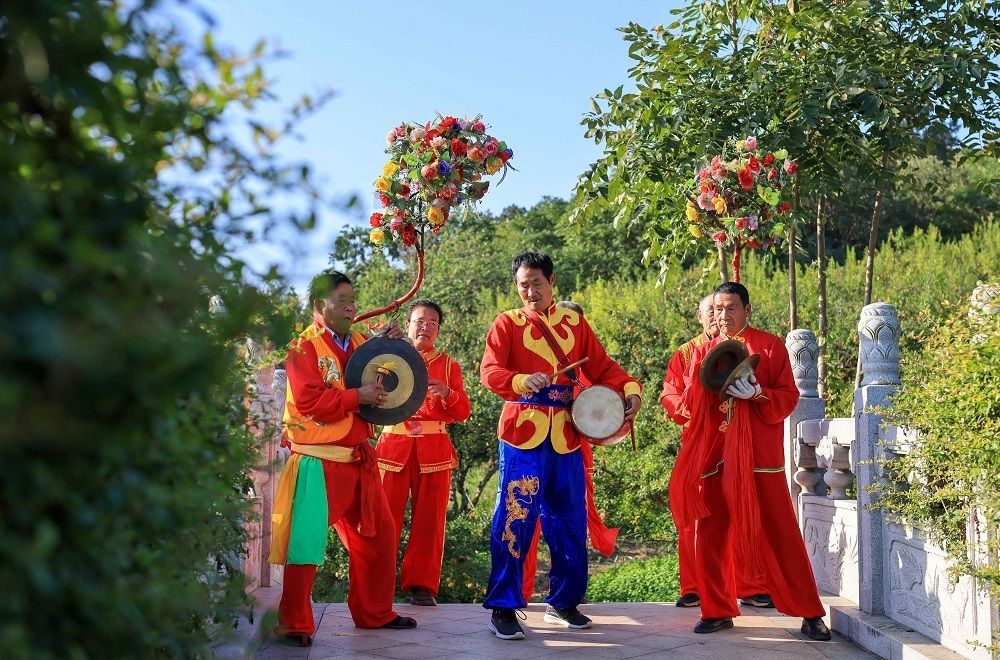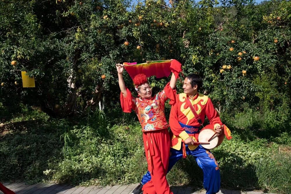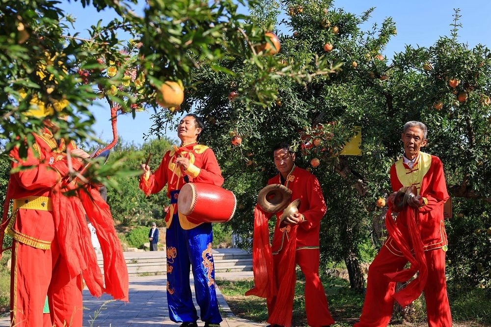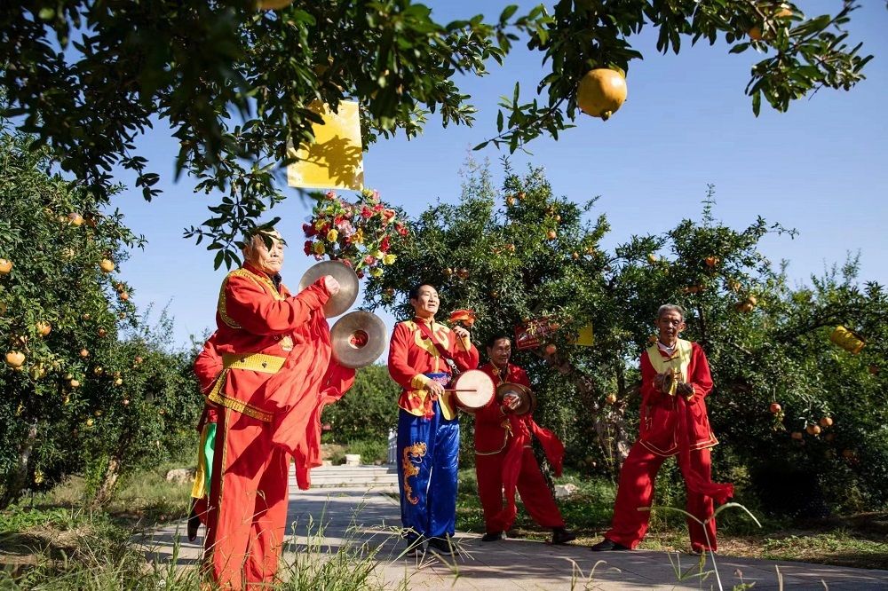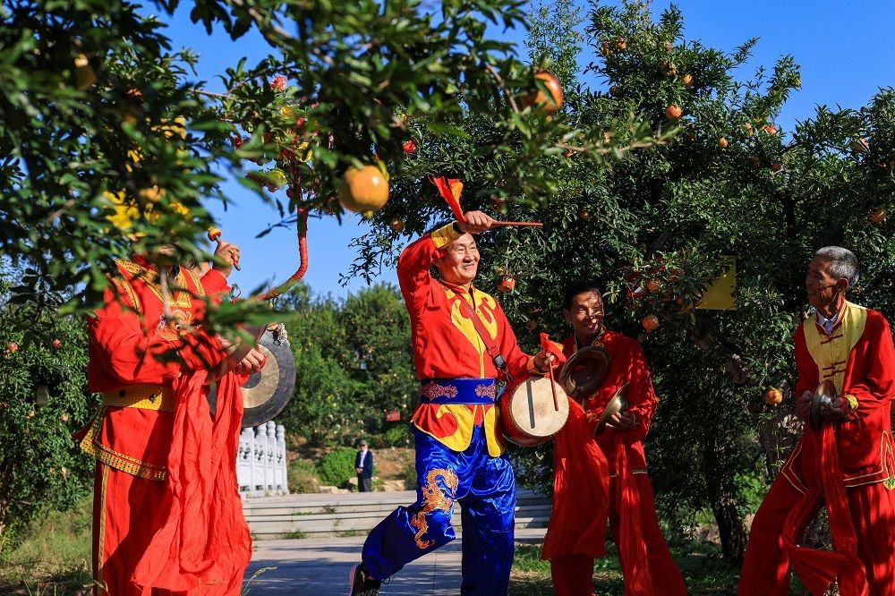近日,花鼓燈藝人們?cè)诖T果累累的石榴樹下跳起舞蹈慶祝豐收。蚌埠市懷遠(yuǎn)縣素有“石榴之鄉(xiāng)”美譽(yù),石榴栽植歷史悠久、品質(zhì)優(yōu)異、久負(fù)盛名,2010年“懷遠(yuǎn)石榴”被評(píng)為國家地理標(biāo)志保護(hù)產(chǎn)品。懷遠(yuǎn)又是“中國民間藝術(shù)(花鼓燈)之鄉(xiāng)”,花鼓燈源于宋代,它承載了淮河流域不同時(shí)期的文明,也存儲(chǔ)了淮河人獨(dú)特的文化觀念,并以活態(tài)的形式傳承至今,是懷遠(yuǎn)縣重要的非物質(zhì)文化遺產(chǎn)和特有的文化資源。