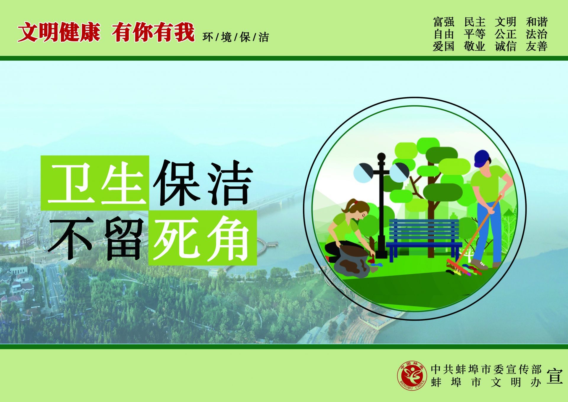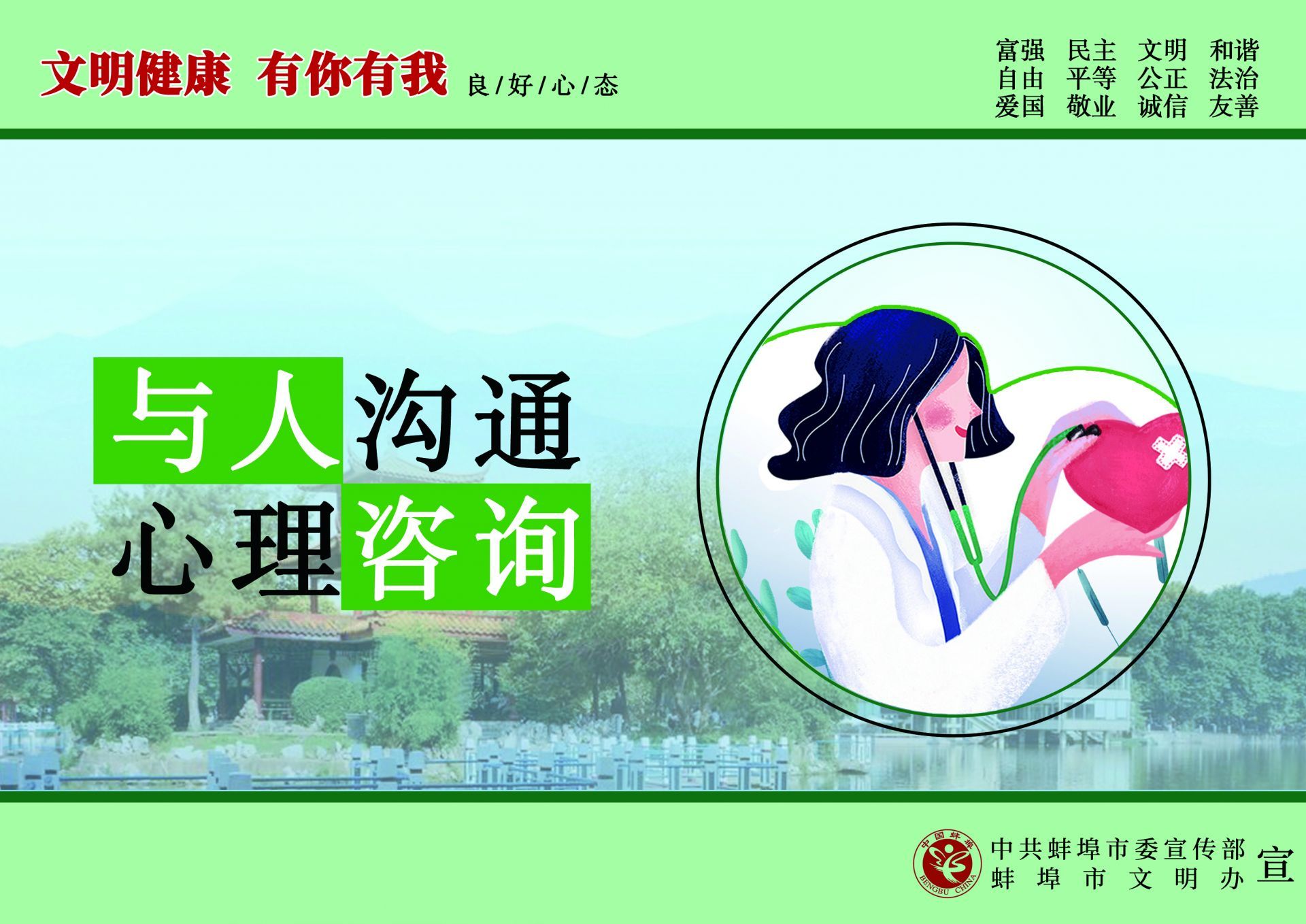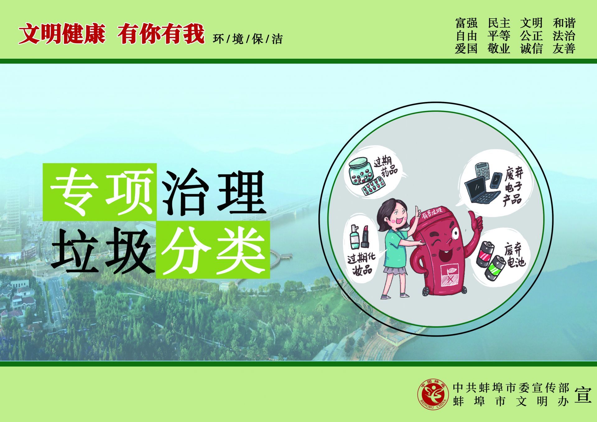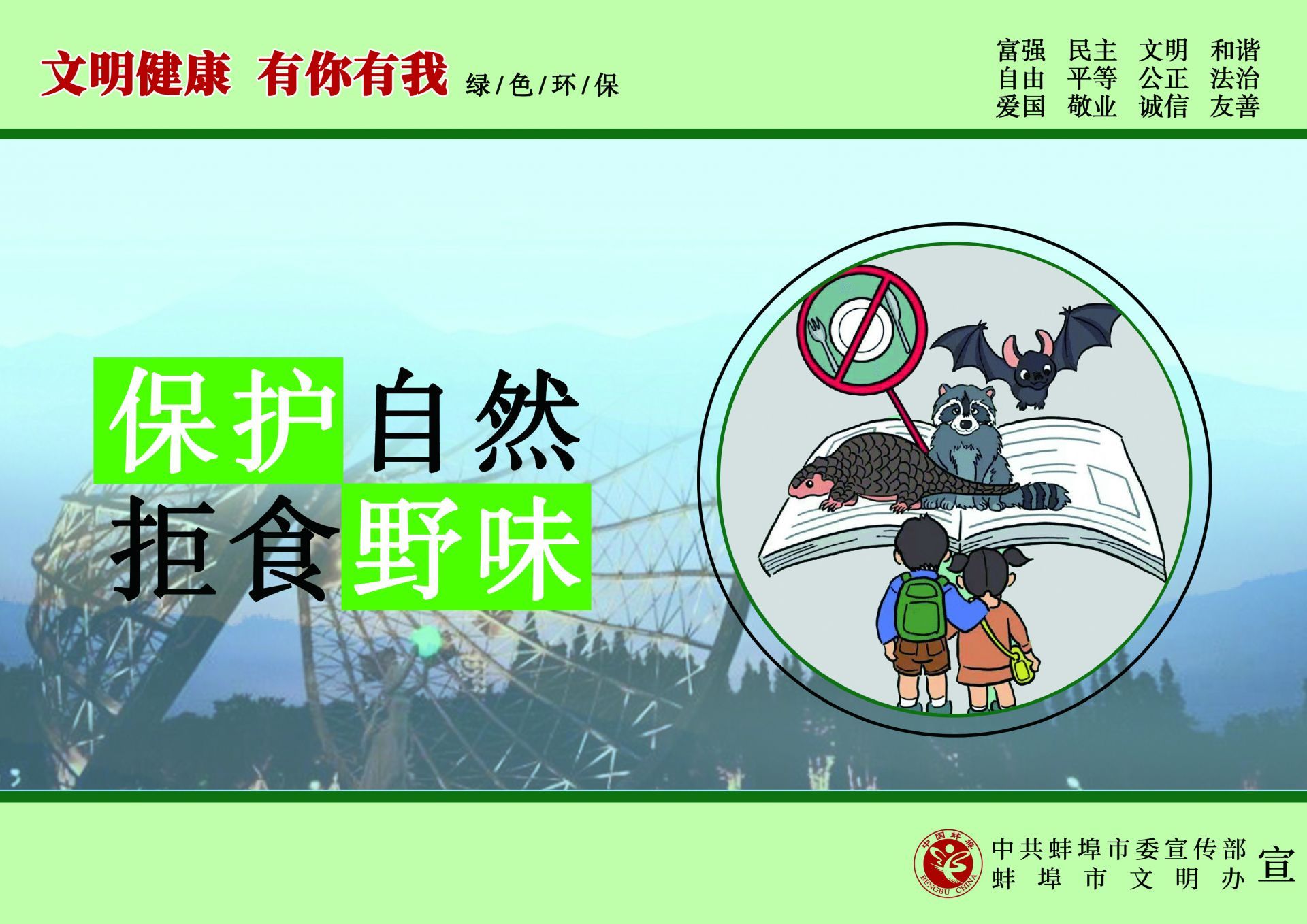 為傳播文明理念、弘揚時代新風,根據中央文明辦《關于開展“文明健康 有你有我”公益廣告宣傳行動的函》的通知精神,中共蚌埠市委宣傳部、蚌埠市文明辦在全市組織開展了“文明健康 有你有我”公益廣告宣傳行動,動員專業和業余美術工作者全力投入設計,廣泛征集作品,用公益廣告傳播文明理念、弘揚時代新風,助力文明城市創建。