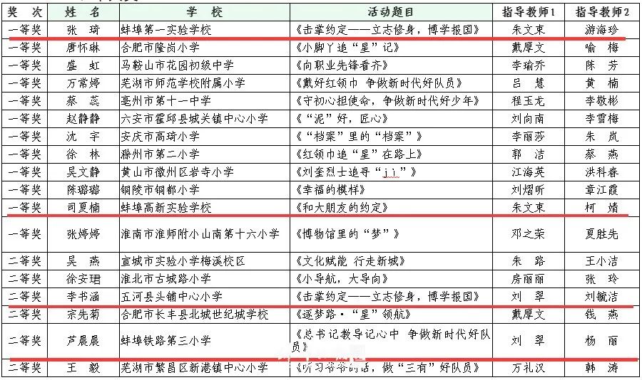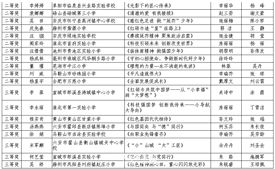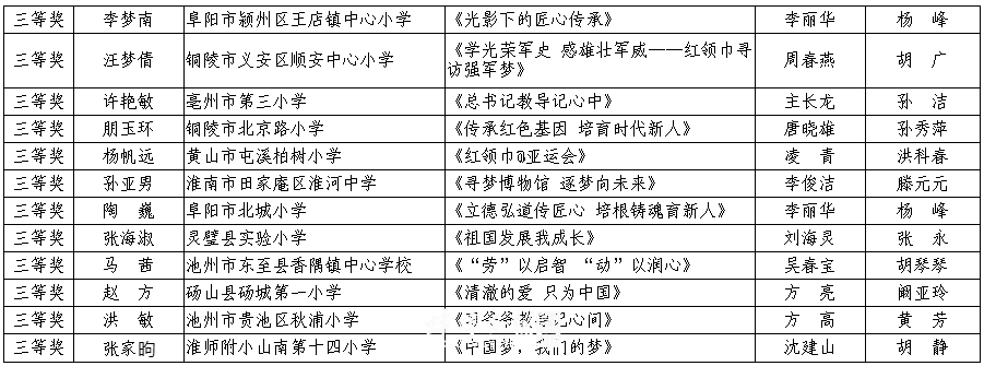 根據(jù)《關(guān)于舉辦2023年安徽省少先隊活動優(yōu)質(zhì)課評選活動的通知》(皖青聯(lián)〔2023〕37號)的要求和程序,團省委、省教育廳、省少工委近期在蚌埠市聯(lián)合舉行了全省少先隊活動優(yōu)質(zhì)課評選,現(xiàn)將結(jié)果予以公示。如有異議,請在公示期間通過電話、郵箱等形式反映情況。反映情況要客觀真實,以個人名義反映情況的材料應(yīng)提供真實姓名、工作單位、聯(lián)系方式,以單位名義反映情況的材料需加蓋單位公章。