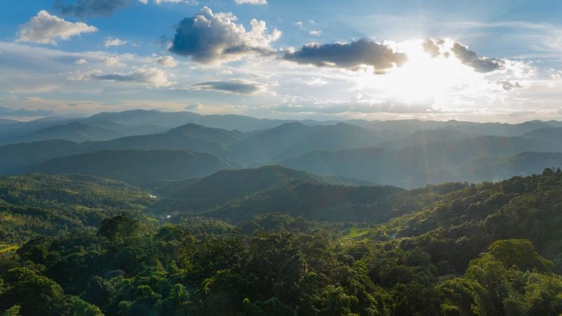 這是2023年9月16日拍攝的日落時分的云南普洱景邁山風光(無人機照片)。新華社記者 胡超 攝