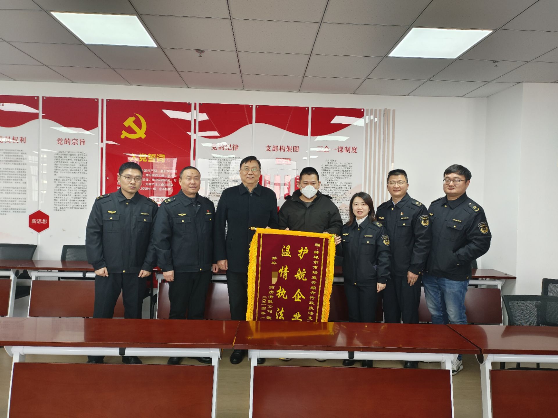 1月12日上午,市市場監管局綜合行政執法支隊收到了某藥房有限公司負責人送來的致謝錦旗,上書“護航企業 溫情執法”,這不僅是對市場監管一線執法人員工作的認可,也是對近年來積極探索市場監管“執法+普法+服務”新模式的肯定。