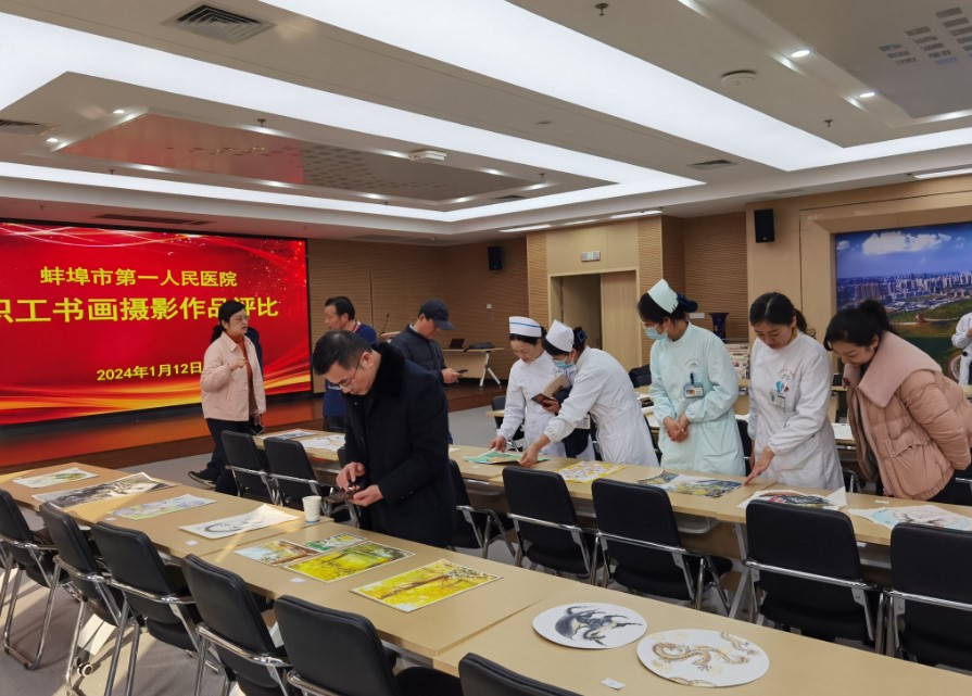 為豐富職工文化生活,蚌埠市第一人民醫院元旦期間舉辦了迎新春職工書畫攝影大賽,并于1月12日下午開展集中展評活動。特邀請市攝影家協會主席王斌、副主席李家富,市書法家協會副主席王泳、副主席崔新旺等專家現場評審,市衛健委工會主任、四級調研員王磊,市一院黨委委員鐘曉飛,副院長徐暉參加活動。