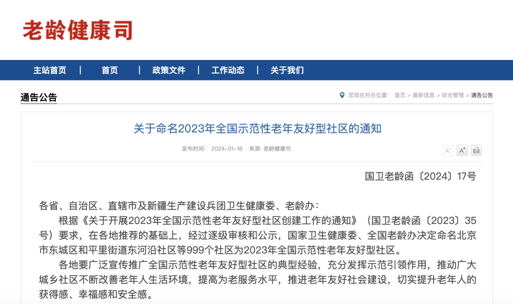 從國家衛生健康委獲悉,根據《關于開展2023年全國示范性老年友好型社區創建工作的通知》,在各地推薦的基礎上,經過逐級審核和公示,國家衛生健康委、全國老齡辦近日聯合印發通知,決定命名北京市東城區和平里街道東河沿社區等999個社區為2023年全國示范性老年友好型社區。