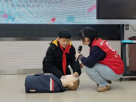 在為期三天的活動中,蚌埠醫科大學“搏時·曙光”急救援宣傳實踐團先后走進常州市武進區洛陽初級中學、合肥市少兒藝術學校、合肥市南崗中學、合肥市蚌埠路第四小學、合肥市包河苑小學,以“知識講授+現場演示+實踐操作”的方式向廣大中小學生講解傳染病預防、心肺復蘇、海姆立克急救法等各種基本技能,受到中小學校師生的一致稱贊。
