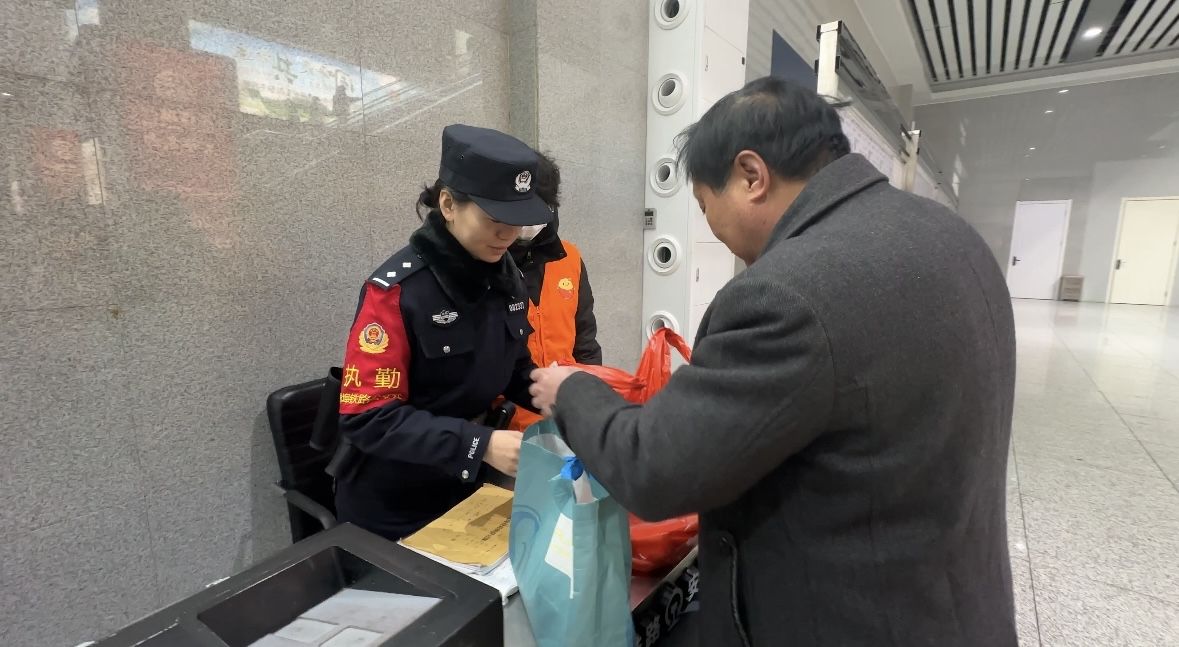 蚌埠文明網訊(融媒體記者 何沛 文/圖)“你好,自發熱食品是不能帶上火車的。”春運大幕開啟,旅客乘火車出行少不了帶著大包小包的行李,連日來,蚌埠鐵路民警進一步加強站場管控、列車巡查、嚴格安檢查危,提醒旅客關注春運出行安全。