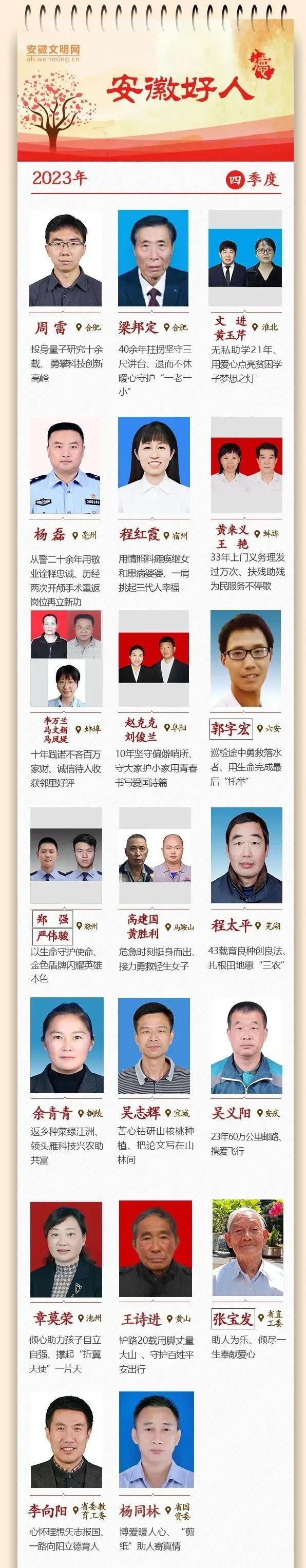 投身量子研究十余載、勇攀科技創(chuàng)新高峰的科大國盾量子技術(shù)股份有限公司黨支部書記、副總裁周雷;40余年拄拐堅(jiān)守三尺講臺、退而不休暖心守護(hù)“一老一小”的合肥市巢湖市烔煬鎮(zhèn)中李小學(xué)退休教師梁邦定;無私助學(xué)21年、用愛心點(diǎn)亮貧困學(xué)子夢想之燈的“公益夫妻”淮北礦業(yè)集團(tuán)員工文進(jìn)、黃玉芹;從警二十余年用敬業(yè)詮釋忠誠、歷經(jīng)兩次開顱手術(shù)重返崗位再立新功的亳州市蒙城縣公安局食品藥品與環(huán)境犯罪偵查大隊(duì)教導(dǎo)員楊磊;用情照料癱瘓繼女和患病婆婆、一肩挑起三代人幸福的宿州市蕭縣黃口鎮(zhèn)朱莊村村民程紅霞;33年上門義務(wù)理發(fā)過萬次、扶殘助殘為民服務(wù)不停歇的蚌埠市龍子湖區(qū)兩站小區(qū)居民黃來義、王艷;十年踐諾不吝百萬家財(cái)、誠信待人收獲鄰里好評的蚌埠市淮上區(qū)吳小街鎮(zhèn)槐花園社區(qū)居民馬鳳堤、李萬蘭、馬文娟;10年堅(jiān)守偏僻哨所、守大家護(hù)小家用青春書寫愛國詩篇的“80后”夫妻91737部隊(duì)三級軍士長趙克克、91737部隊(duì)“哨所一員”劉俊蘭;巡檢途中勇救落水者、用生命完成最后“托舉”的六安市金寨縣梅山鎮(zhèn)三灣村安林組居民,原滬蓉高鐵金寨工區(qū)巡防員郭字宏;以生命守護(hù)使命、金色盾牌閃耀英雄本色的原滁州市來安縣公安局特(巡)警大隊(duì)突擊隊(duì)隊(duì)員鄭強(qiáng)、滁州市來安縣公安局特(巡)警大隊(duì)三中隊(duì)班長嚴(yán)偉駿;危急時(shí)刻挺身而出、接力勇救輕生女子的馬鞍山藍(lán)天汽車出租公司出租車司機(jī)高建國、漢馬科技集團(tuán)股份有限公司班組長黃勝利;43載育良種創(chuàng)良法、扎根田地惠“三農(nóng)”的“土專家”蕪湖市南陵縣籍山鎮(zhèn)三連村村民程太平;返鄉(xiāng)種菜綠江洲、領(lǐng)頭雁科技興農(nóng)助共富的銅陵市樅陽縣樅陽鎮(zhèn)新豐村村民余青青;苦心鉆研山核桃種植、把論文寫在山林間的“森林醫(yī)生”宣城市寧國市林業(yè)事業(yè)發(fā)展中心副主任吳志輝;23年60萬公里郵路、攜愛飛行的“桐山鴻雁”安慶市太湖縣郵政分公司北中支局郵遞員吳義陽;傾心助力孩子自立自強(qiáng)、撐起“折翼天使”一片天的池州市貴池區(qū)杏花村街道孔井社區(qū)居民章莫榮;護(hù)路20載用腳丈量大山、守護(hù)百姓平安出行的老黨員黃山市徽州區(qū)富溪鄉(xiāng)新田村村民王詩進(jìn);助人為樂、傾盡一生奉獻(xiàn)愛心的原安徽新華發(fā)行集團(tuán)退休員工張寶發(fā);心懷理想矢志報(bào)國、一路向陽立德育人的“靈魂”工程師中國科學(xué)技術(shù)大學(xué)信息與智能學(xué)部執(zhí)行部長兼任計(jì)算機(jī)科學(xué)與技術(shù)學(xué)院執(zhí)行院長李向陽;博愛暖人心、“剪紙”助人寄真情的淮河能源集團(tuán)老礦區(qū)事務(wù)管理處洞山工作站內(nèi)退職工楊同林。