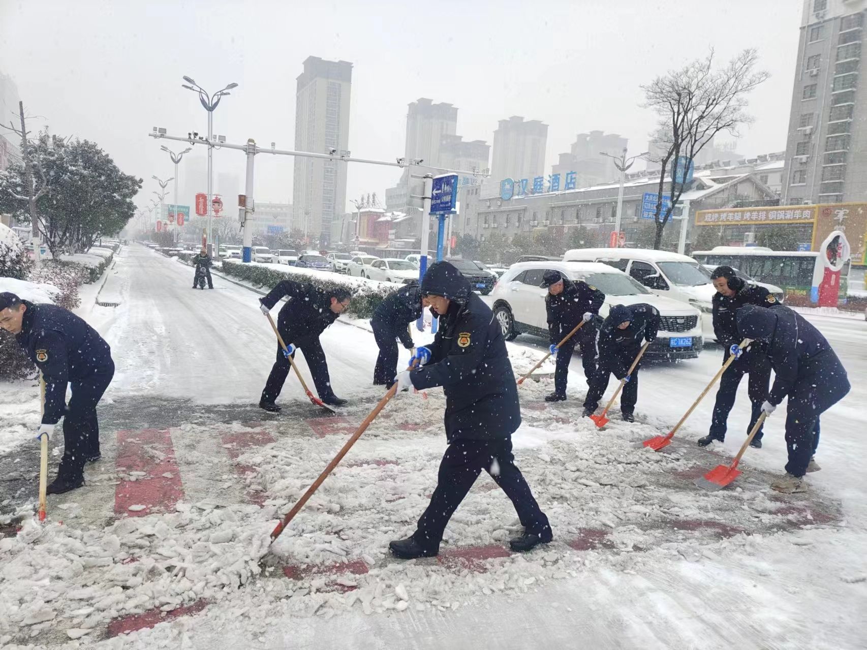 執法隊員冒雪清除重點路段冰雪
