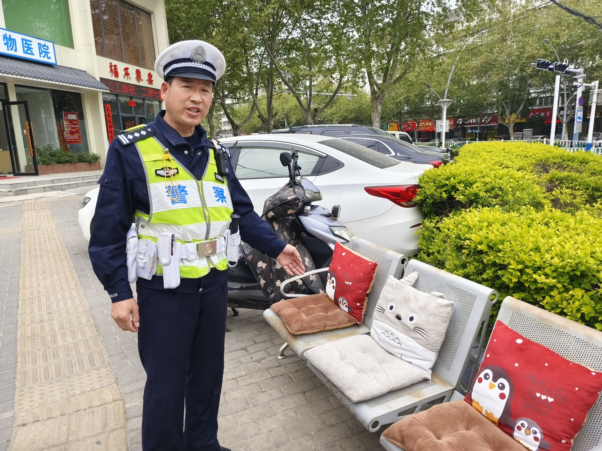 后來,考慮到像張大爺的老人不止一位,吳忠好索性地記下了所有附近老人的活動規律,并告訴所有同事,即便自己不在崗亭值班,執勤同事也會護送老人平安出行。“轄區有五、六個行動不便老人常過馬路,我們都給他們及家屬留了聯系電話,一旦遇到困難,我們會第一時間提供幫助。” 吳忠好還說,為了方便老人和行人歇腳,他還特意在崗亭外安置了一條長椅。