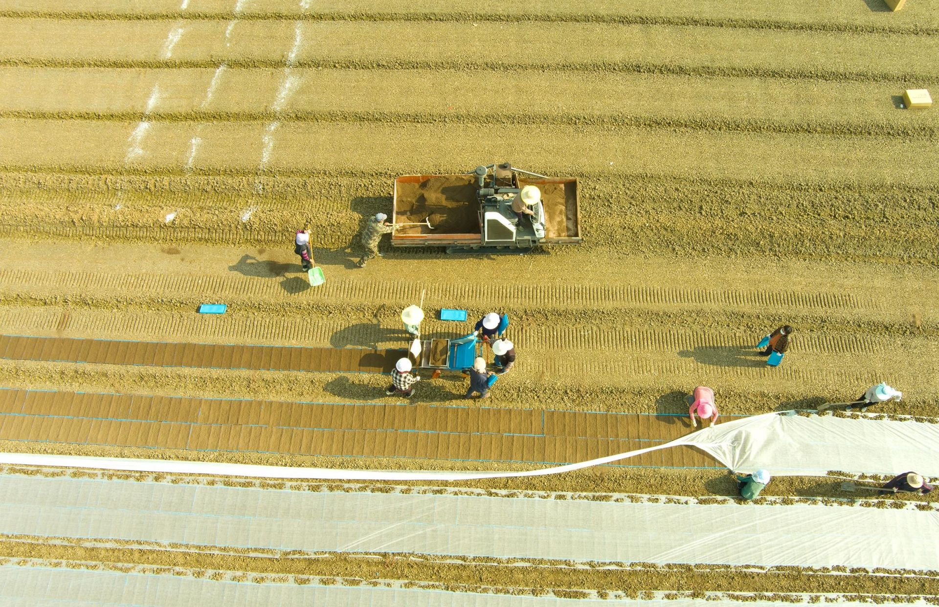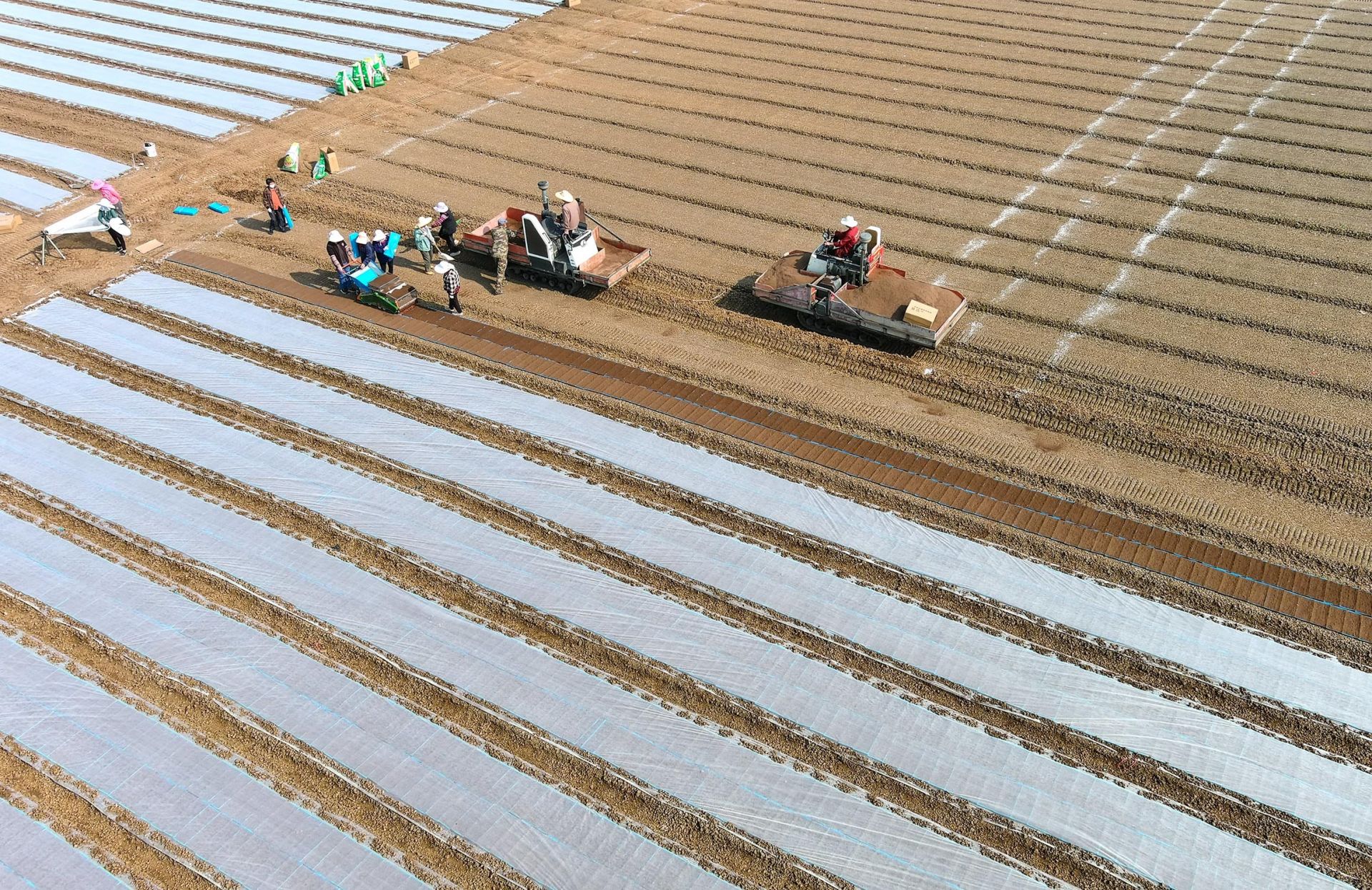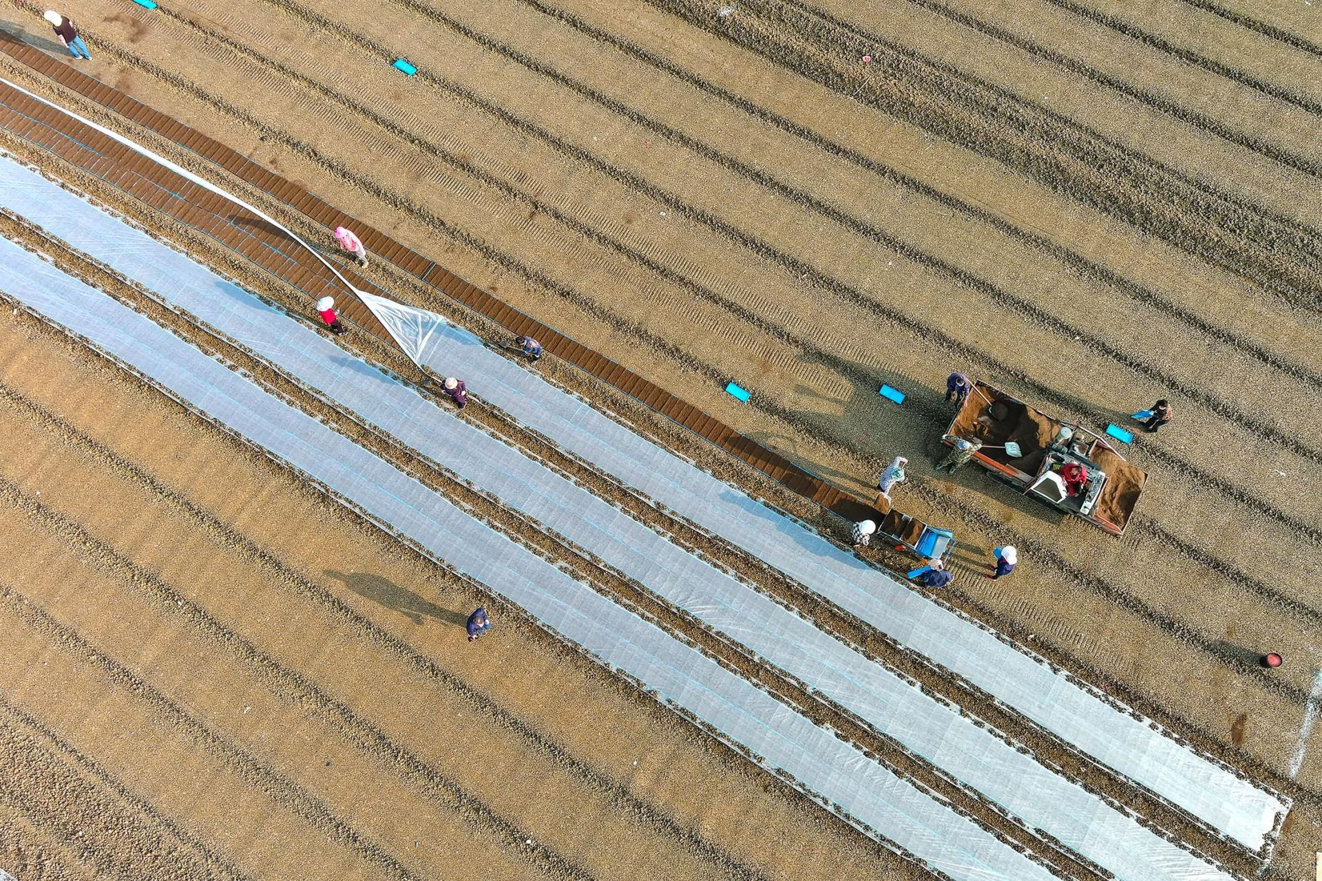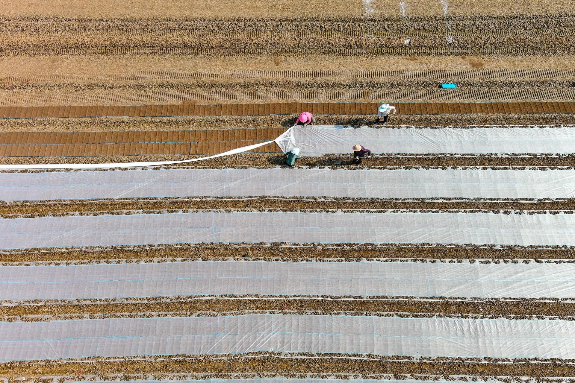 5月13日,安徽省蚌埠市五河縣沱湖鄉大崗村,農戶正在用無紡布覆蓋播種機播種的秧種。 立夏過后,五河縣全面進入農忙時節,農戶搶抓當前氣溫適宜播種的有利時機,以推廣水稻科技育秧技術為抓手,積極探索農藝農機融合發展社會化服務新模式,通過營養土拌種入秧盤、暗化催芽進曬場、現代化噴灌等工序,覆蓋專業無紡布,保持土壤濕度和溫度,減少病害發生,降低種植風險,提升稻米品質,大幅度提升了秧種的播種效率,減少病蟲害的發生,確保全縣60萬畝水稻豐產豐收。
