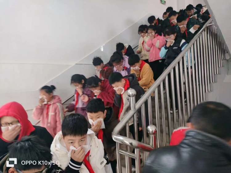 上午9點,警報聲響起,老師們沉著冷靜地指揮學(xué)生捂住口鼻,彎腰有序快速地撤離本班教室,沿著指定路線撤離到安全地帶。全校師生撤離到安全地帶后,各班立即清點人數(shù),并及時向總指揮匯報疏散情況。