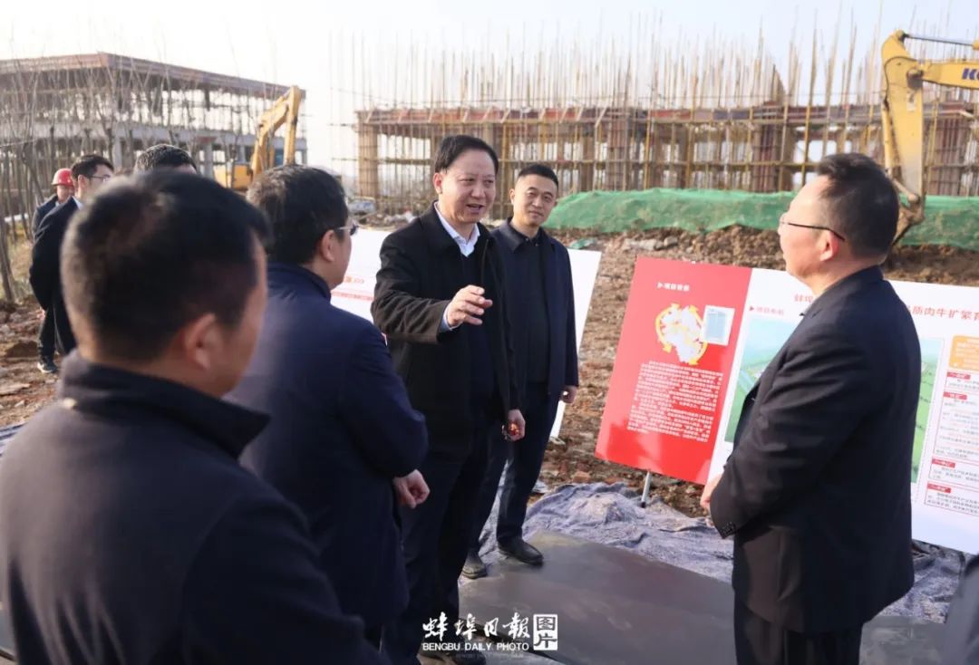 蚌埠鄉村振興集團高品質肉牛擴繁育肥示范場項目位于曹老集鎮,將打造集“肉牛養殖、良種繁育、飼料生產、糞污處理”為一體的國內一流良種繁育和育成牛育肥基地。黃曉武現場察看施工進度,詳細了解項目進度、規劃設計等情況,強調要進一步加快建設進度,優化運營模式,積極探索聯農帶農新模式,發展“智慧+生態”一體化肉牛養殖體系。