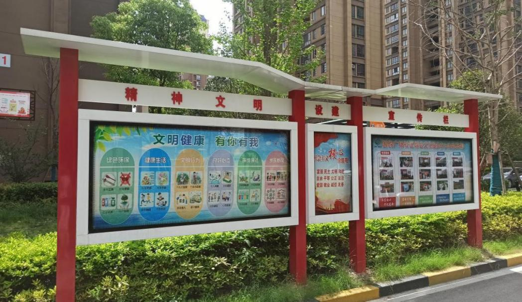 1.顯著位置展示不少于1處公益廣告(含倡導文明健康綠色環保生活方式主題內容)。2.設置精神文明建設宣傳欄,每季度更新內容。3.設置要素齊全的15分鐘便民生活服務圈導視牌。